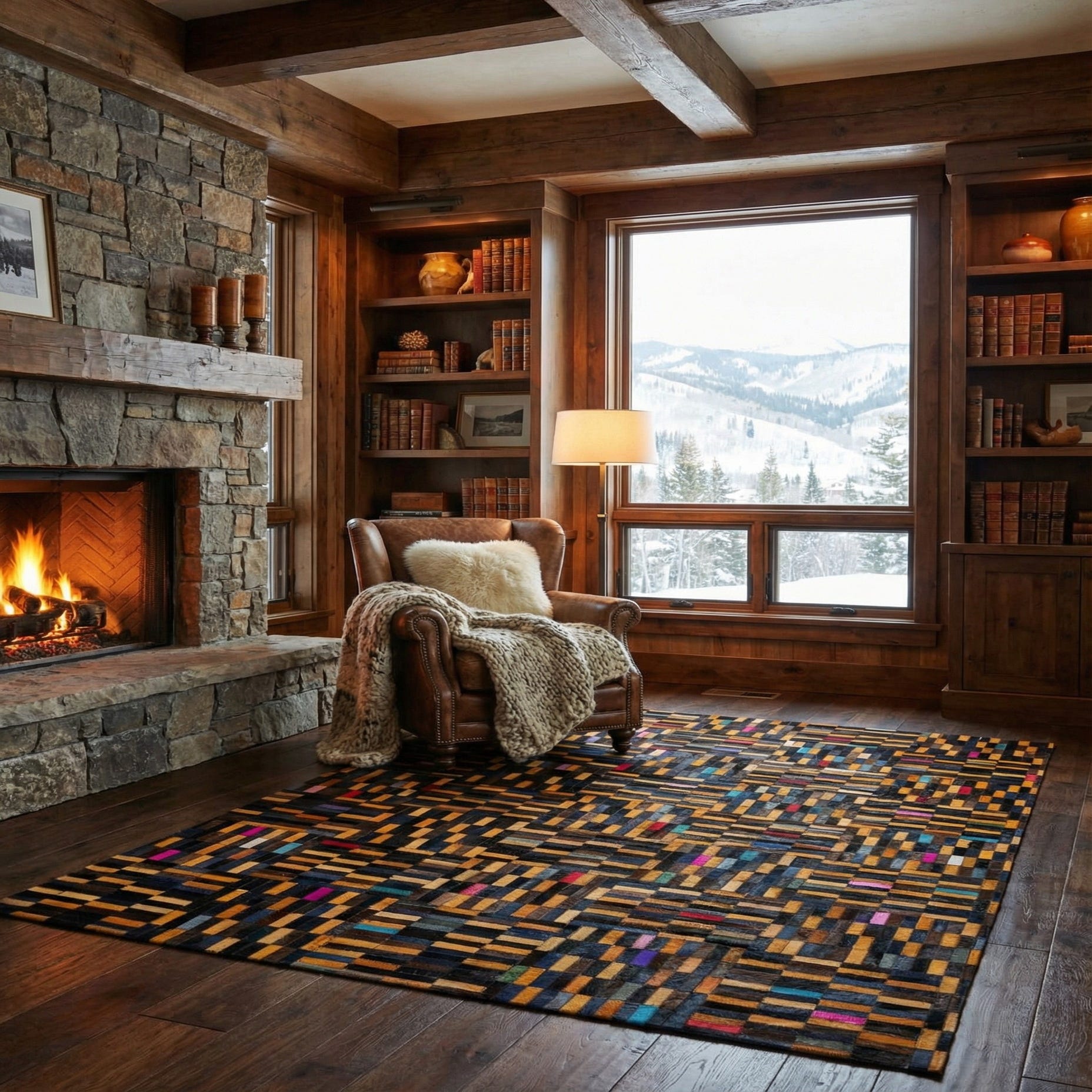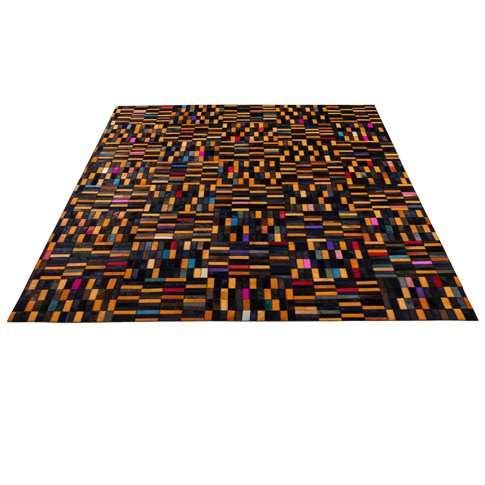 A 5x8 rectangular Cowhide Patchwork rug featuring a modern stripe pattern in multi-colored hues, ideal for a living room.