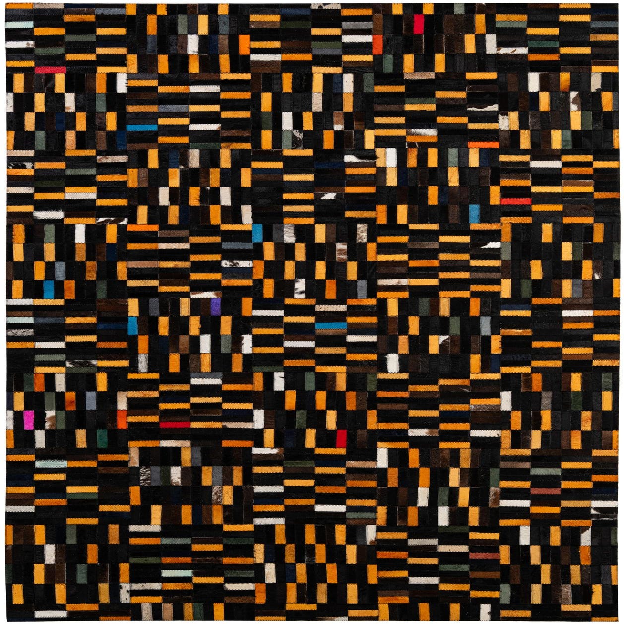 A 5x8 rectangular, multi-colored patchwork cowhide rug with a modern stripe pattern, featuring black, orange, and various accent color rectangles.