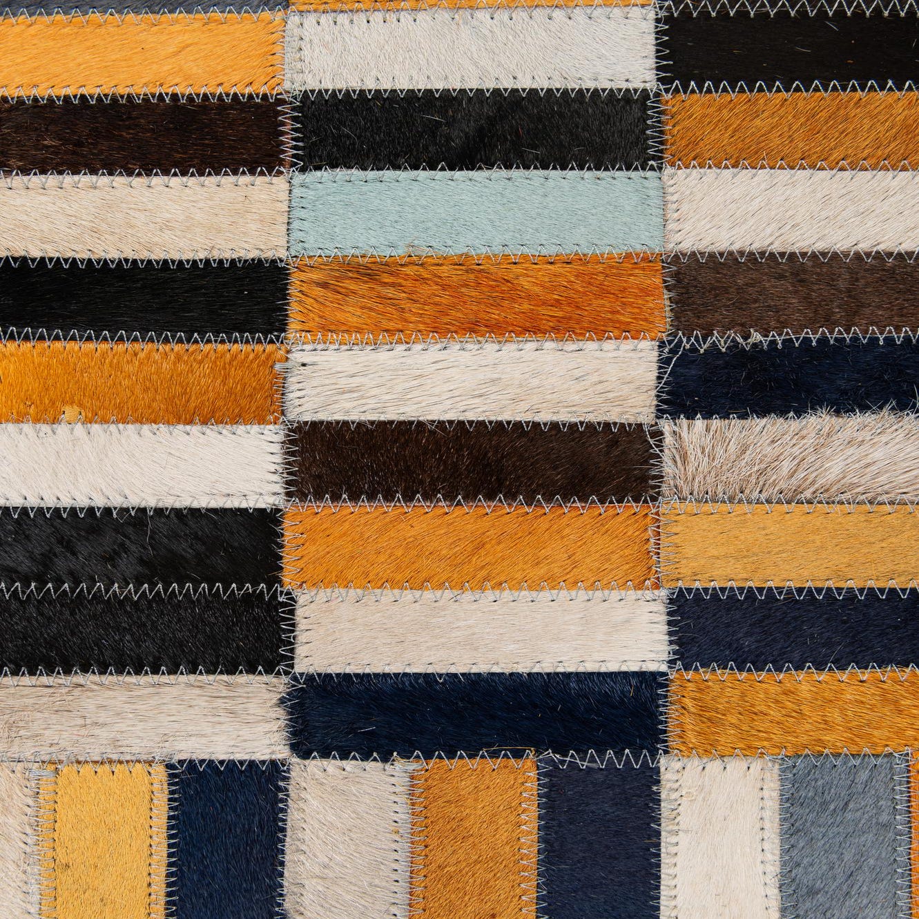 A rectangular 5x8 multi-colored patchwork cowhide rug with a modern stripe pattern, featuring various shades of brown, black, white, orange, blue, and red.