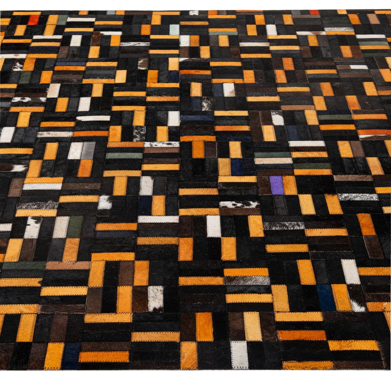 Hand made of cowhide and leather, this patchwork rug assembles narrow rectangular hides into a compact, brick-like grid. The multi background is anchored by deep black panels and bright orange bands, with accents of blue, brown, ivory, purple and yellow scattered throughout. The hair-on-hide patches offer a soft, slightly glossy surface while the leather strips provide a firmer, matte contrast; hand-stitched seams create gentle relief and a tactile, layered feel.
