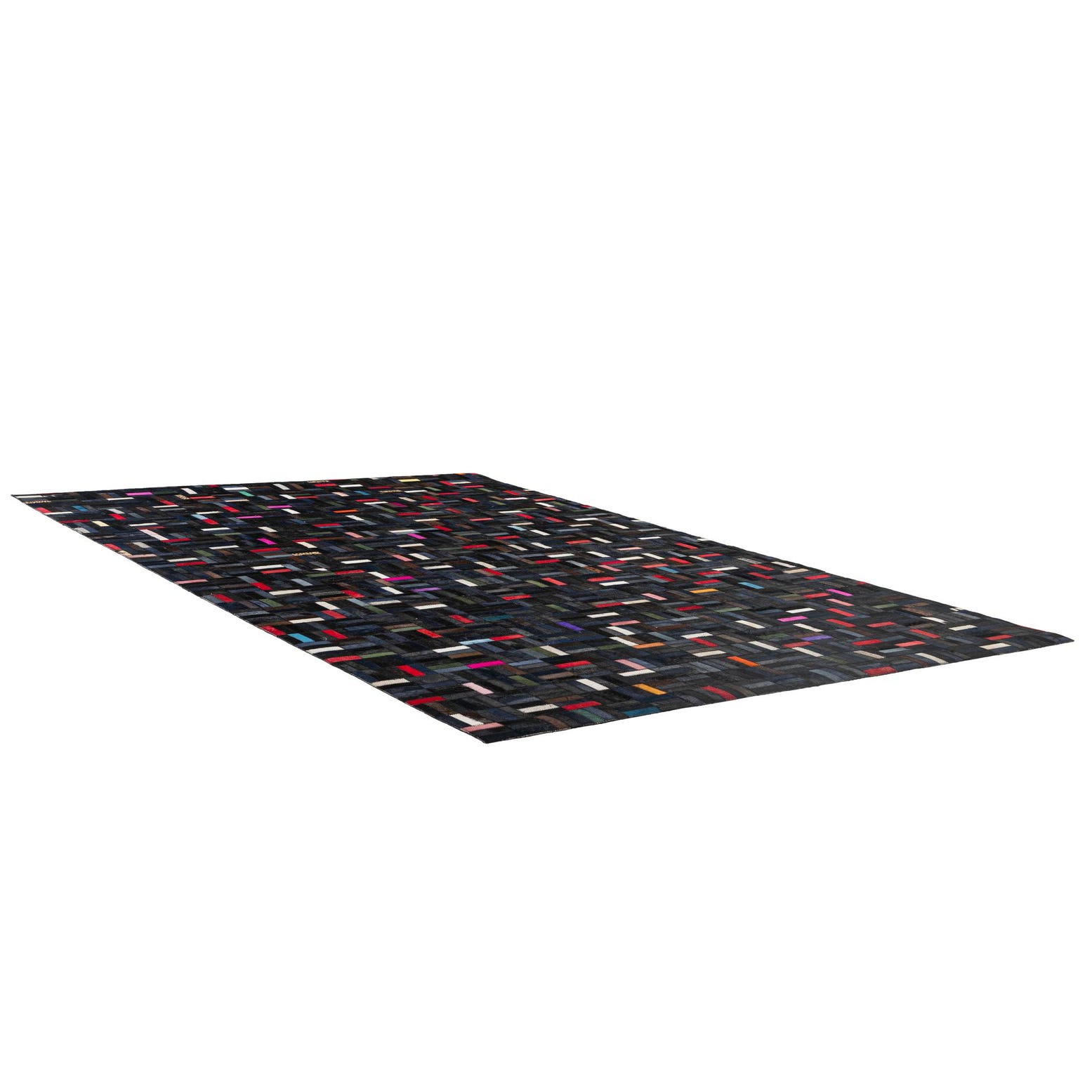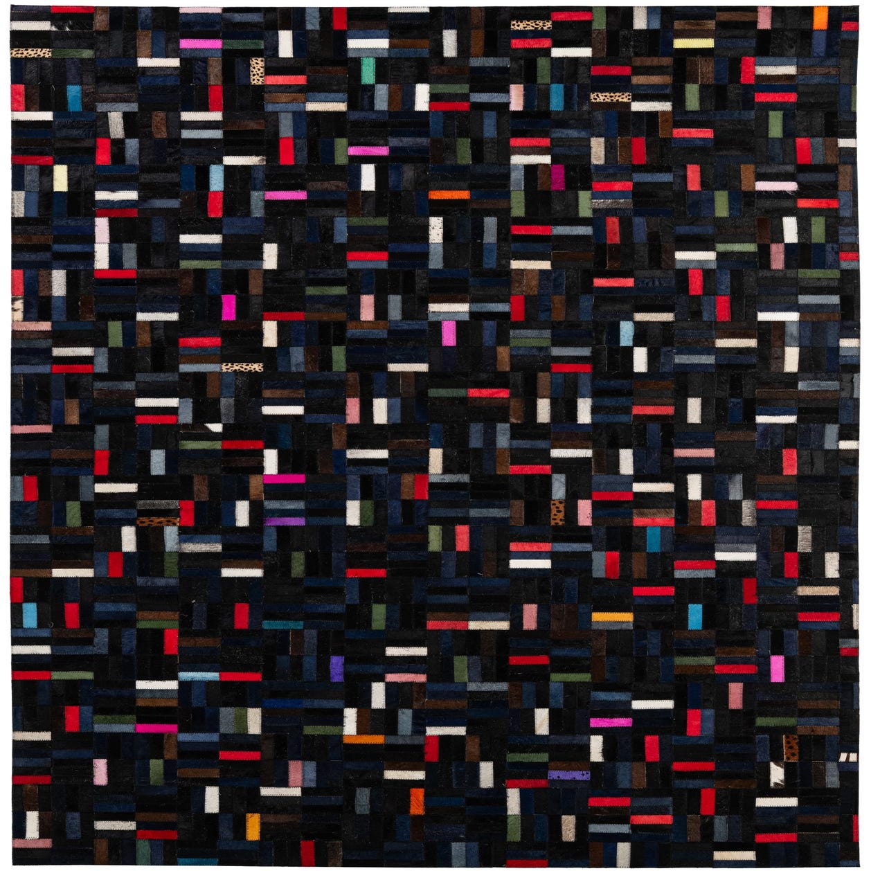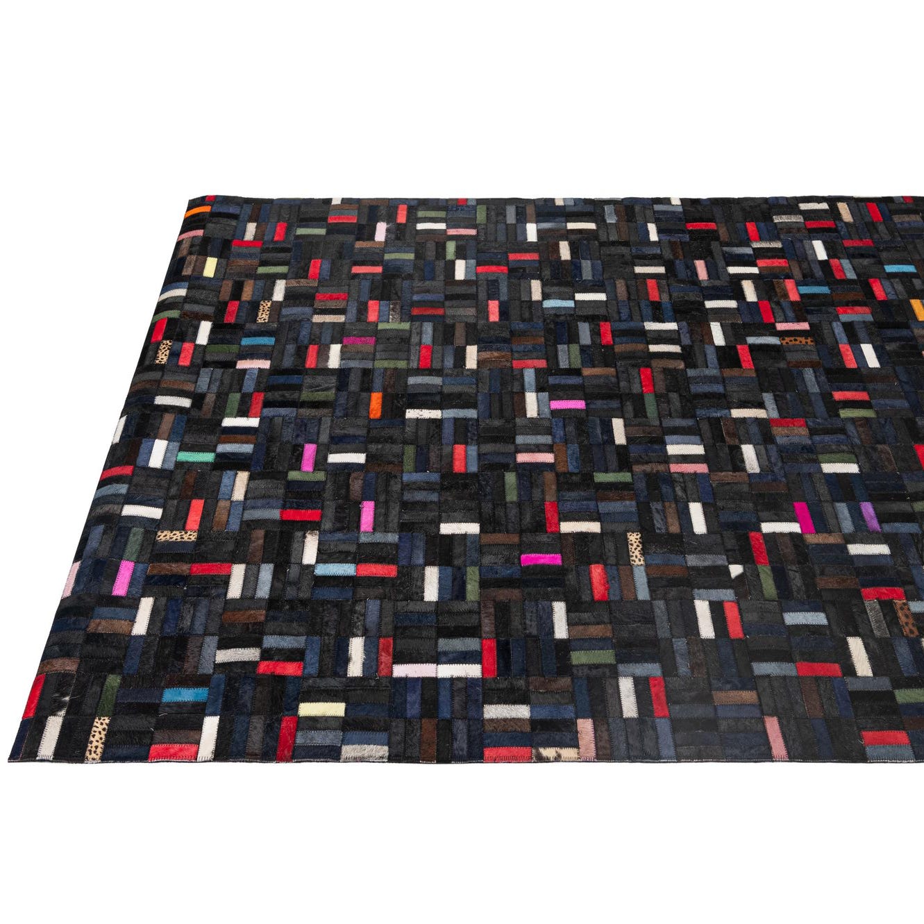 Handmade of cowhide and leather, this patchwork rug assembles narrow rectangular pieces into a dense, geometric mosaic. Deep blacks and navy blues form the backdrop while pops of red, pink, yellow, green, brown and gray punctuate the field, with occasional spotted leather pieces adding a playful contrast. The hair-on-hide surface feels soft underfoot and shows subtle nap and stitch lines between patches, giving the piece a tactile, low-profile texture and a crafted, layered appearance.