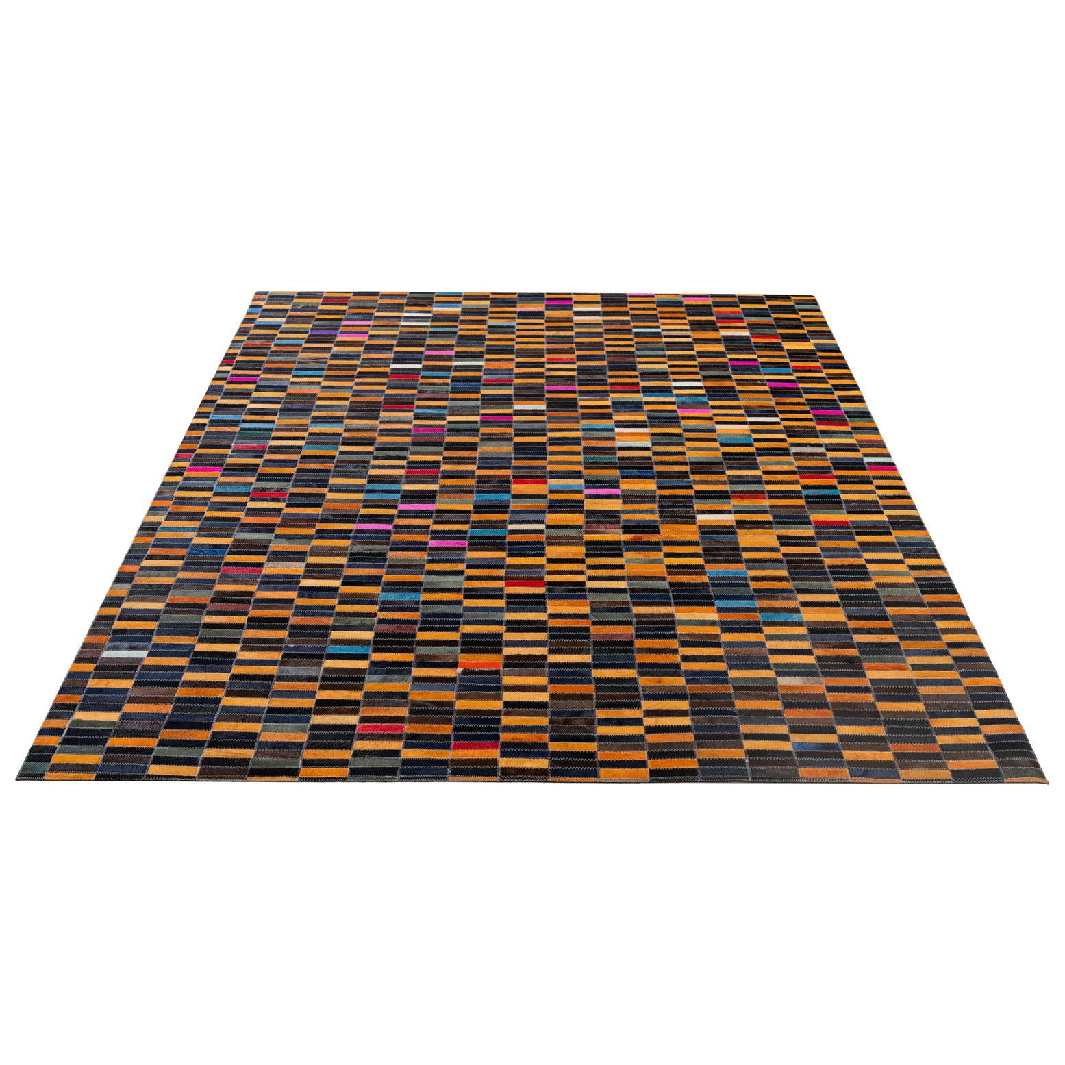A 5x8 rectangular Cowhide Patchwork rug featuring a modern stripe pattern in multi-colored hues, ideal for a living room.