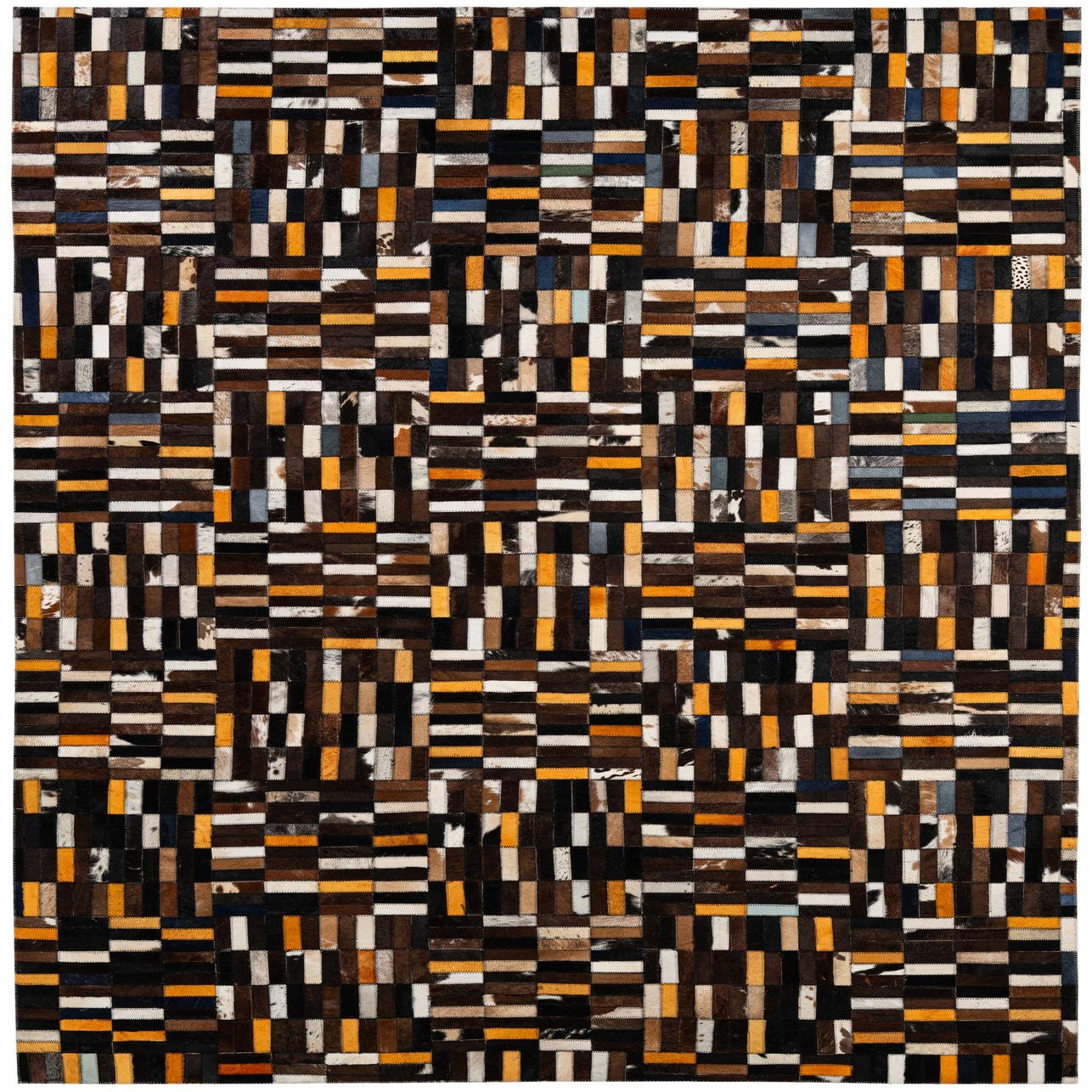 A rectangular 5x8 modern patchwork cowhide rug with multi-colored stripes in brown, black, white, and orange tones.