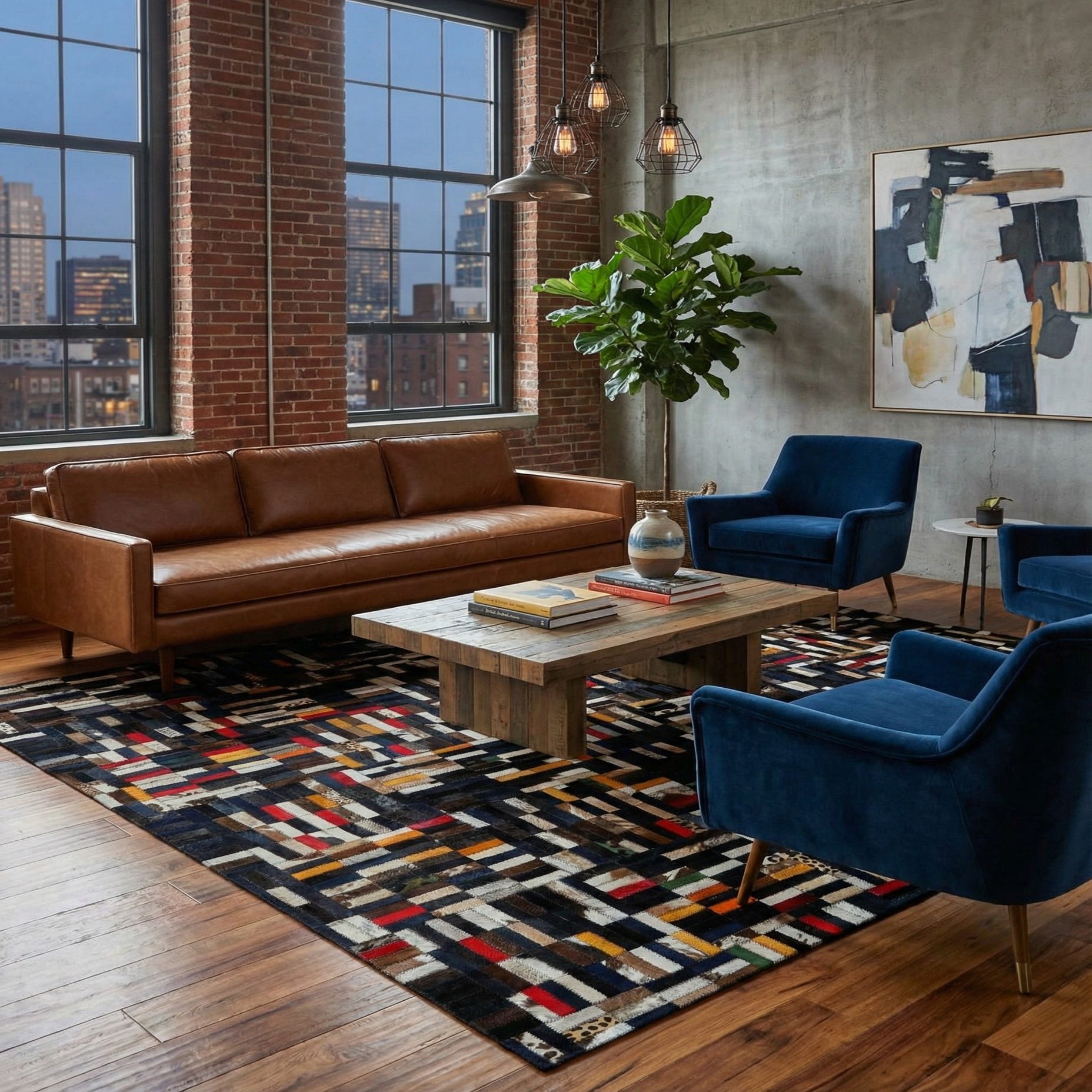 This piece works well in contemporary and eclectic interiors where pattern and texture are focal points—place it beneath a low-profile sofa to add warmth and graphic interest or layer it in a study or home office for a dynamic foundation. It also complements industrial or gallery-style spaces that benefit from organic materials and bold color contrast, and it pairs nicely with leather furniture, warm wood tones, and minimalist metal accents.