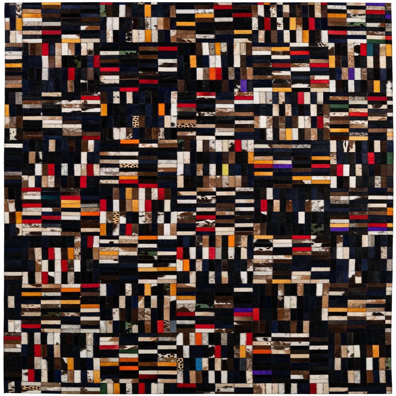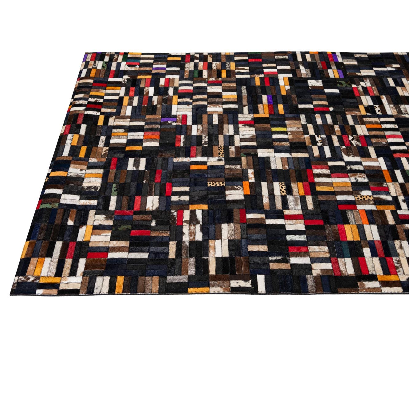 A dense patchwork of narrow rectangular strips forms a geometric, grid-like mosaic that balances order and movement. Hand made from cowhide and leather, the surface offers the tactile contrast of soft hair-on-hide with the firmer seams of stitched leather panels. The background color is multi, anchored by deep blacks and rich browns, while pops of red, orange, yellow, blue, green and purple thread through the composition alongside ivory and beige accents for layered visual depth. The short, velvety nap has a subtle sheen and natural variation in each hide, giving the rug a tangible, handcrafted quality underfoot.