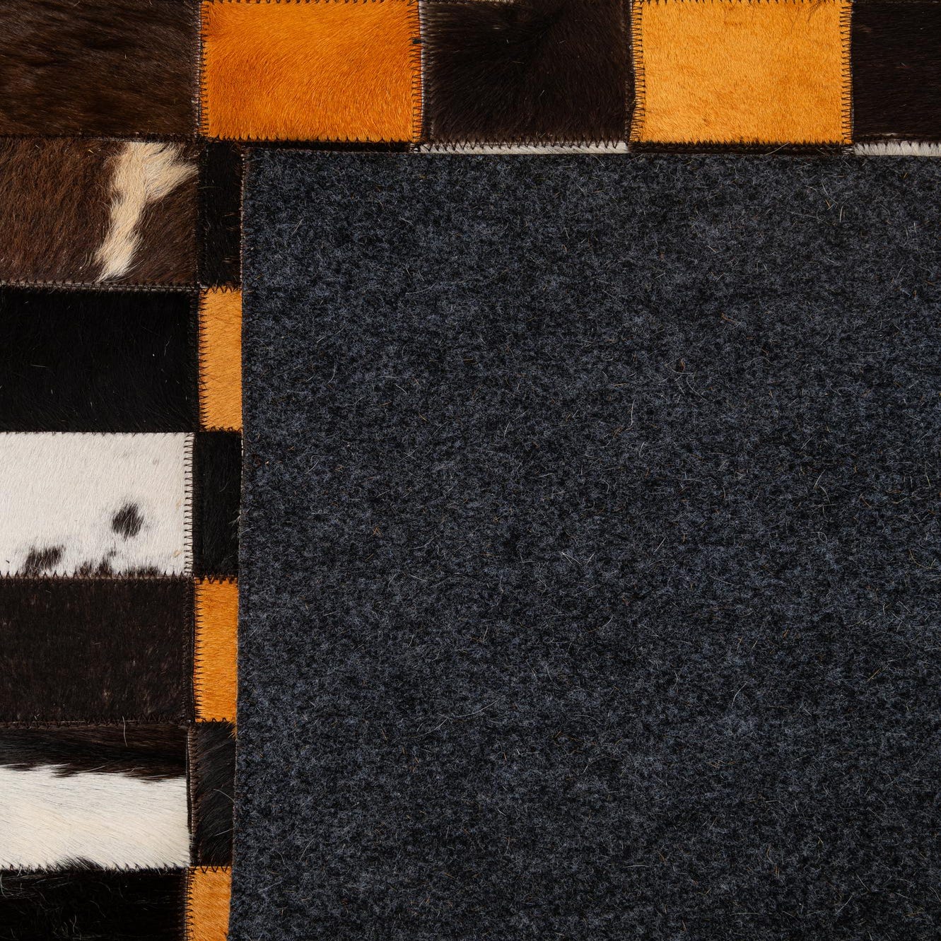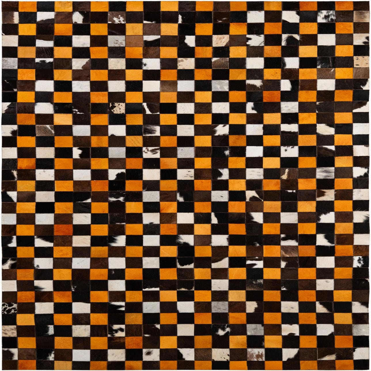 A 5x8 rectangular Cowhide - Patchwork rug featuring a checkerboard pattern of black, white, brown, and orange squares.