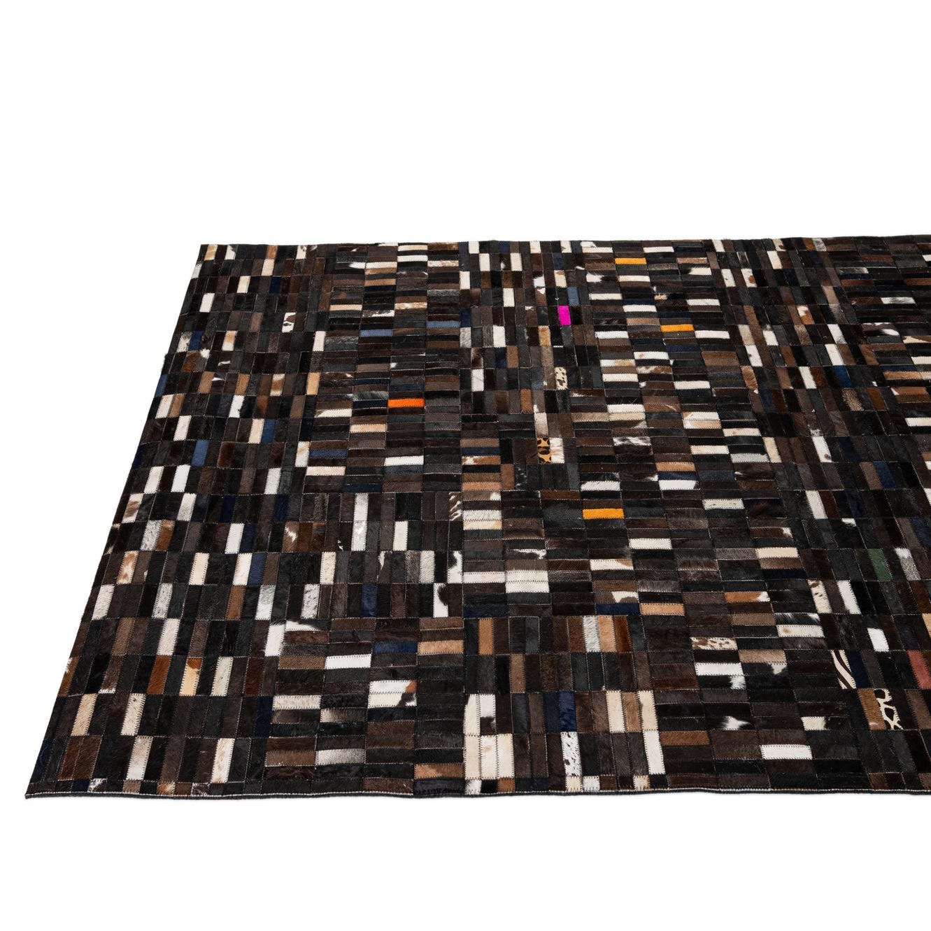 A 5x8 rectangular Cowhide Patchwork rug featuring a modern stripe pattern in multi-colored natural cowhide and leather.