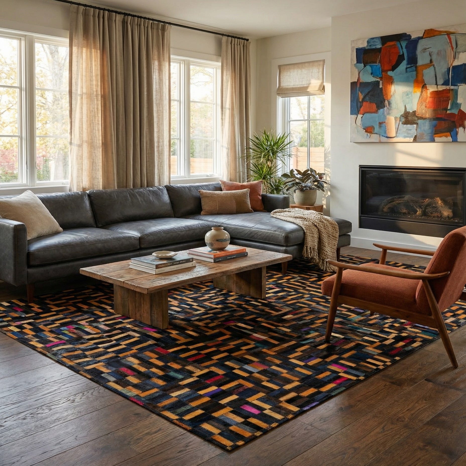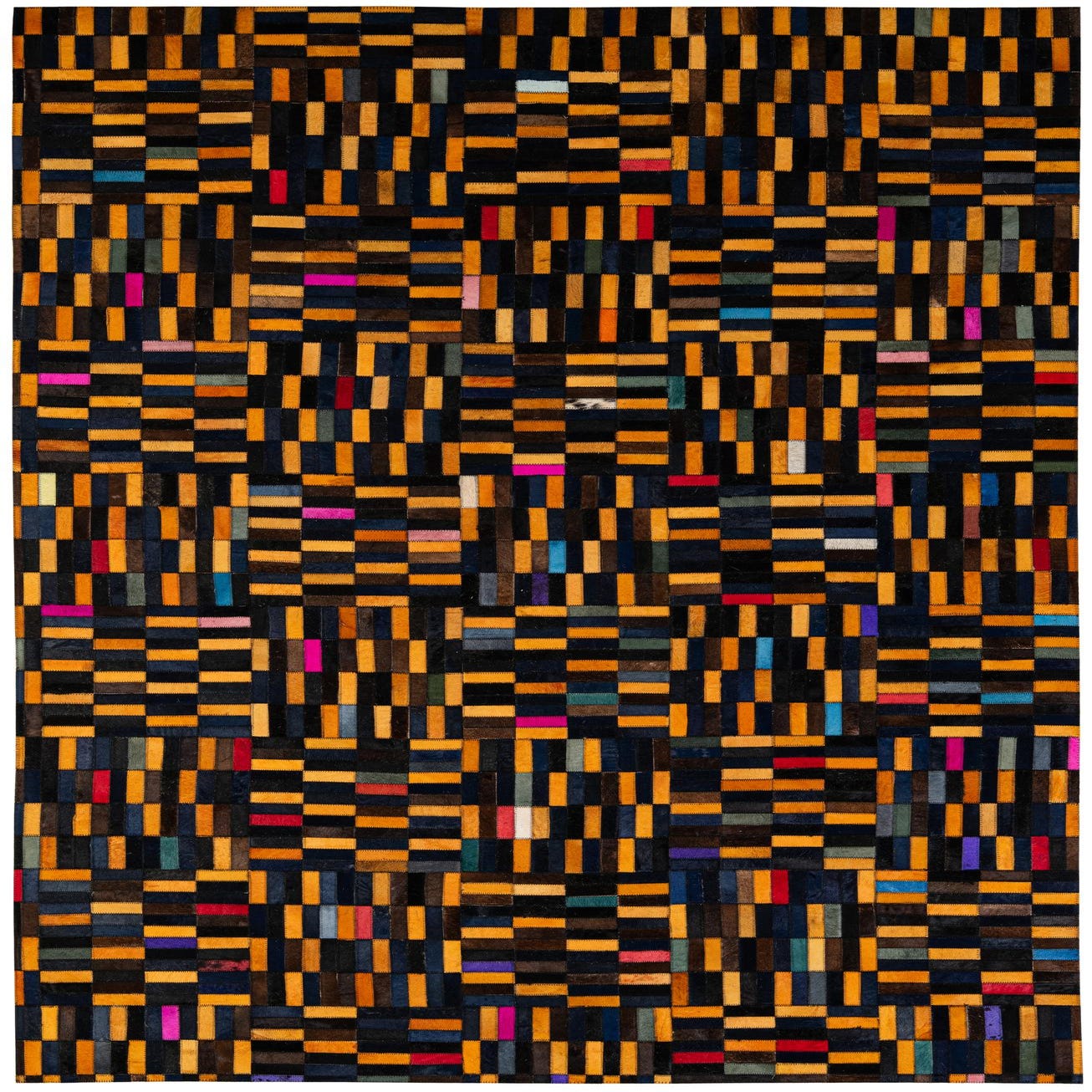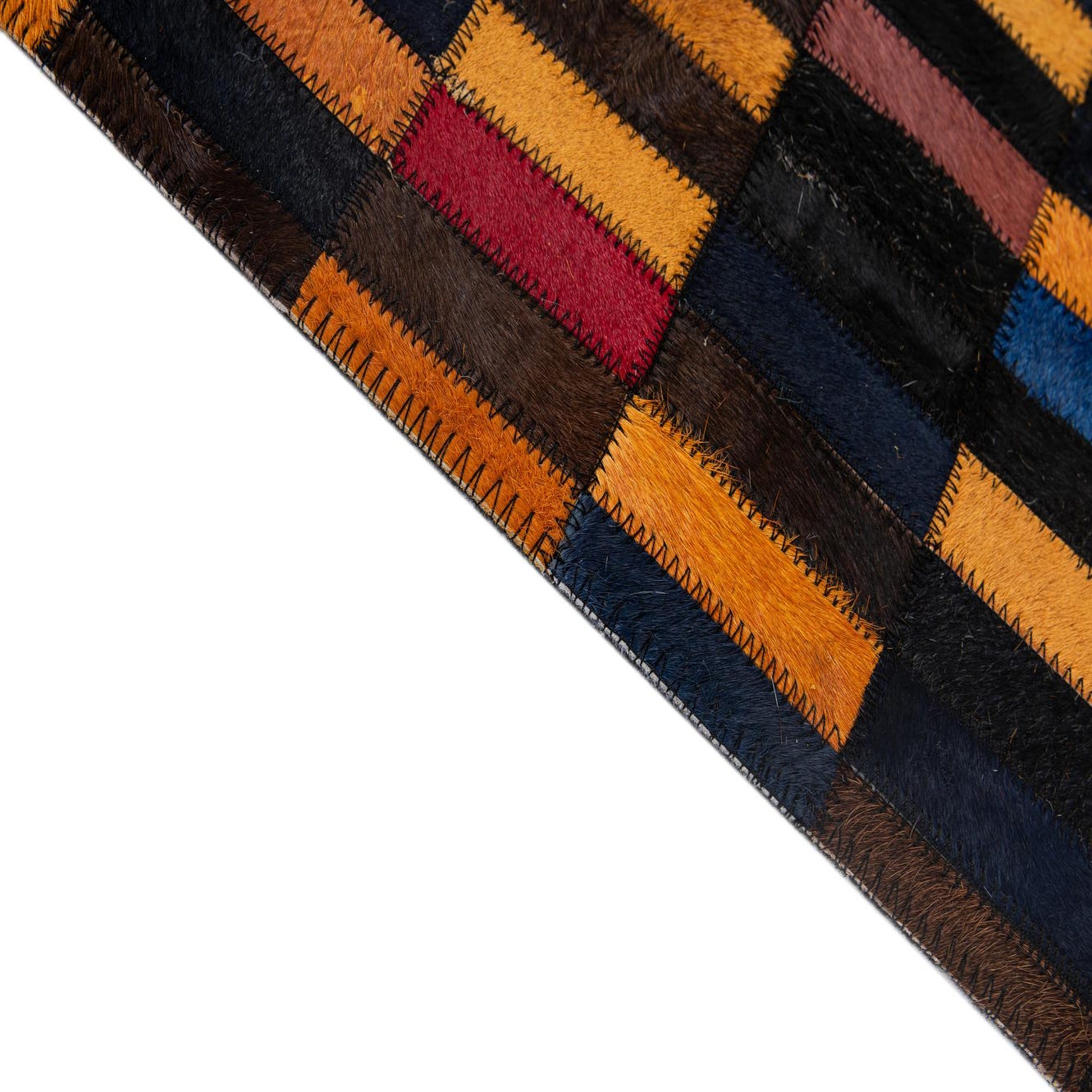 A 5x8 rectangular multi-colored cowhide rug featuring a modern patchwork stripe pattern with black, orange, and various bright accent colors.
