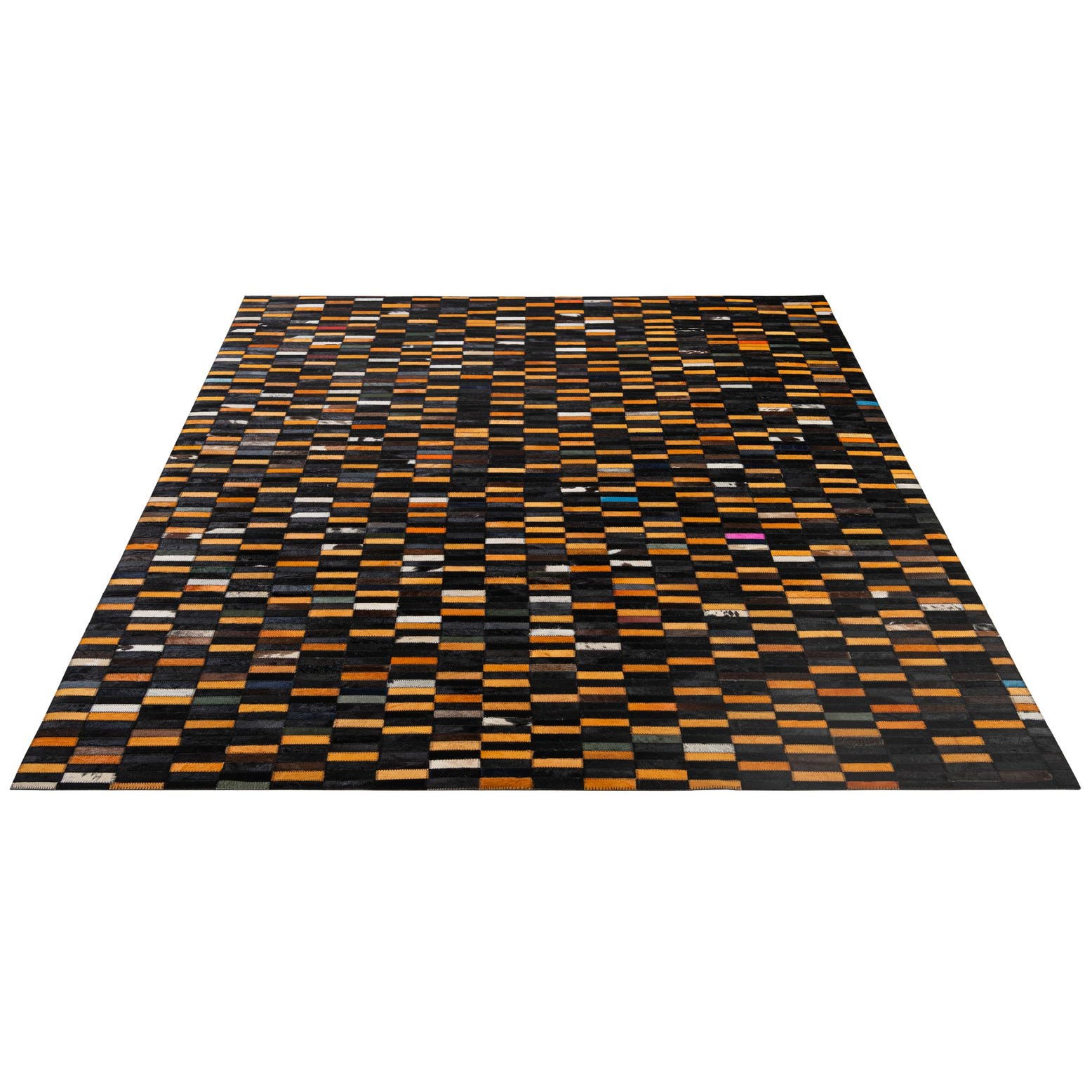 A 5x8 rectangular Cowhide & Leather rug with a modern stripe pattern in multi-colored patches, ideal for a living room.