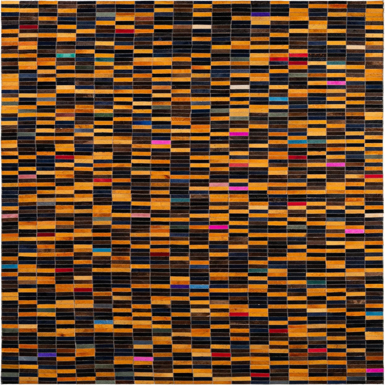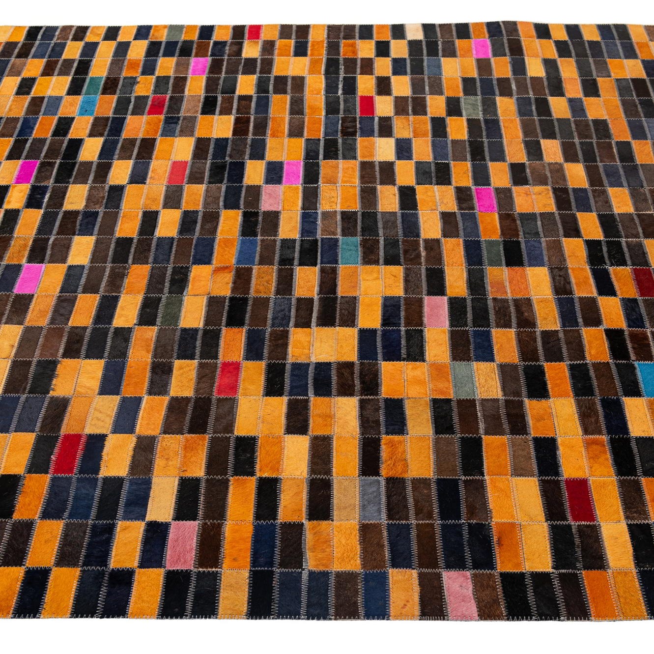 A 5x8 rectangular Cowhide Patchwork rug featuring a modern pattern of multi-colored rectangles, primarily gold and dark brown, with occasional bright accent colors.