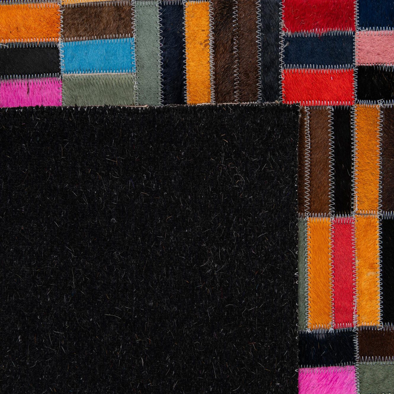 A 5x8 rectangular Cowhide - Patchwork rug featuring a modern multi-colored design with various sized rectangular patches in shades of black, brown, red, orange, yellow, blue, pink, and purple.
