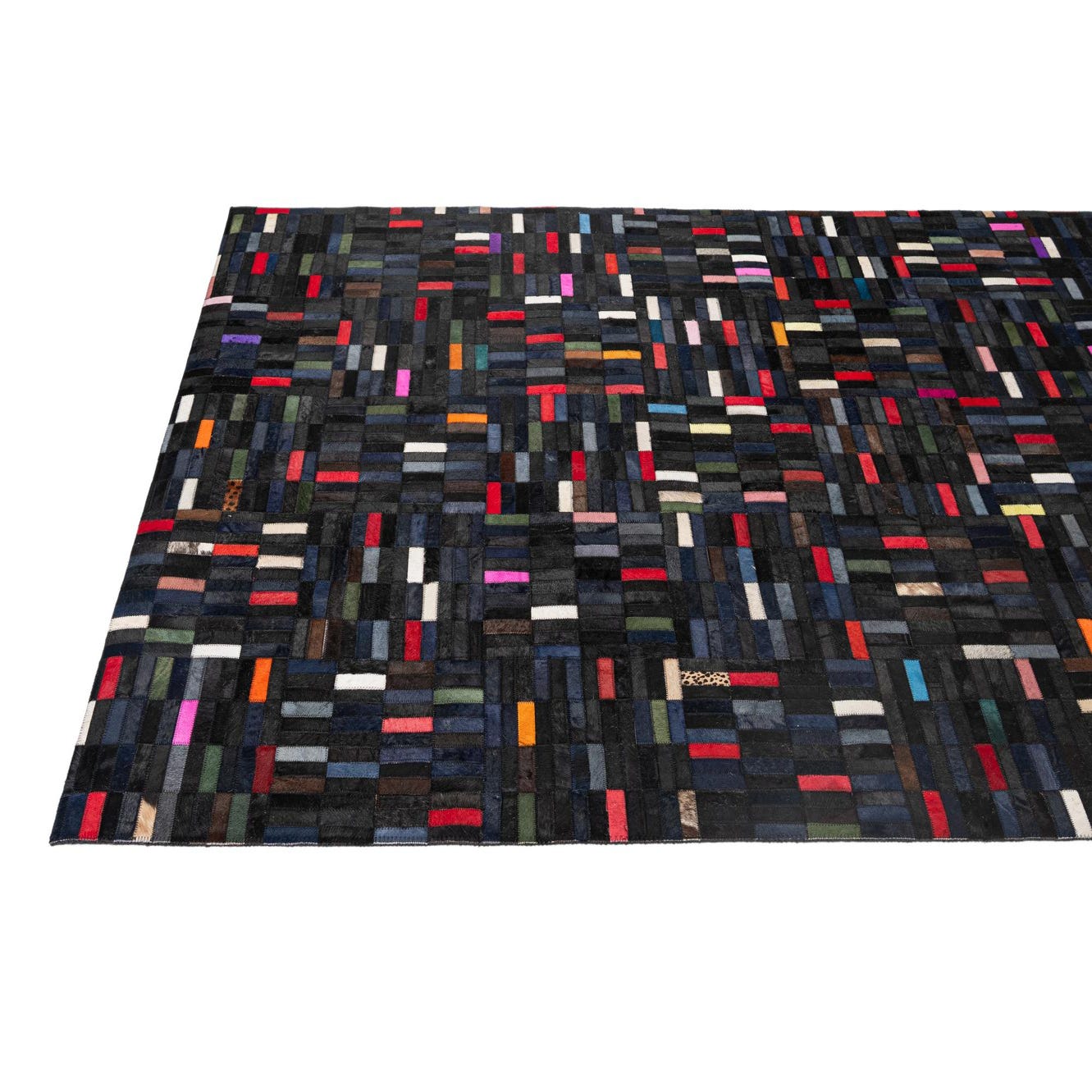 A 5x8 rectangular modern patchwork cowhide rug featuring a multi-colored design with black, red, white, blue, green, and orange rectangular patches.