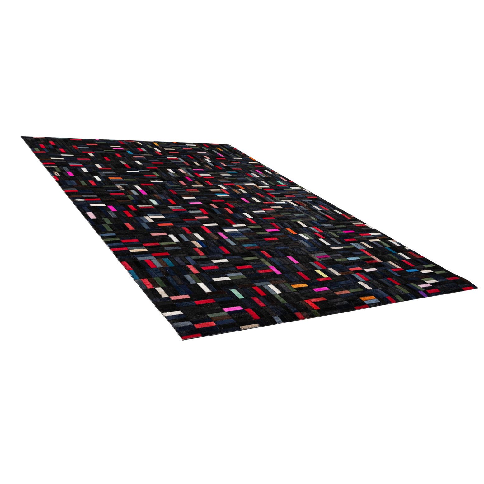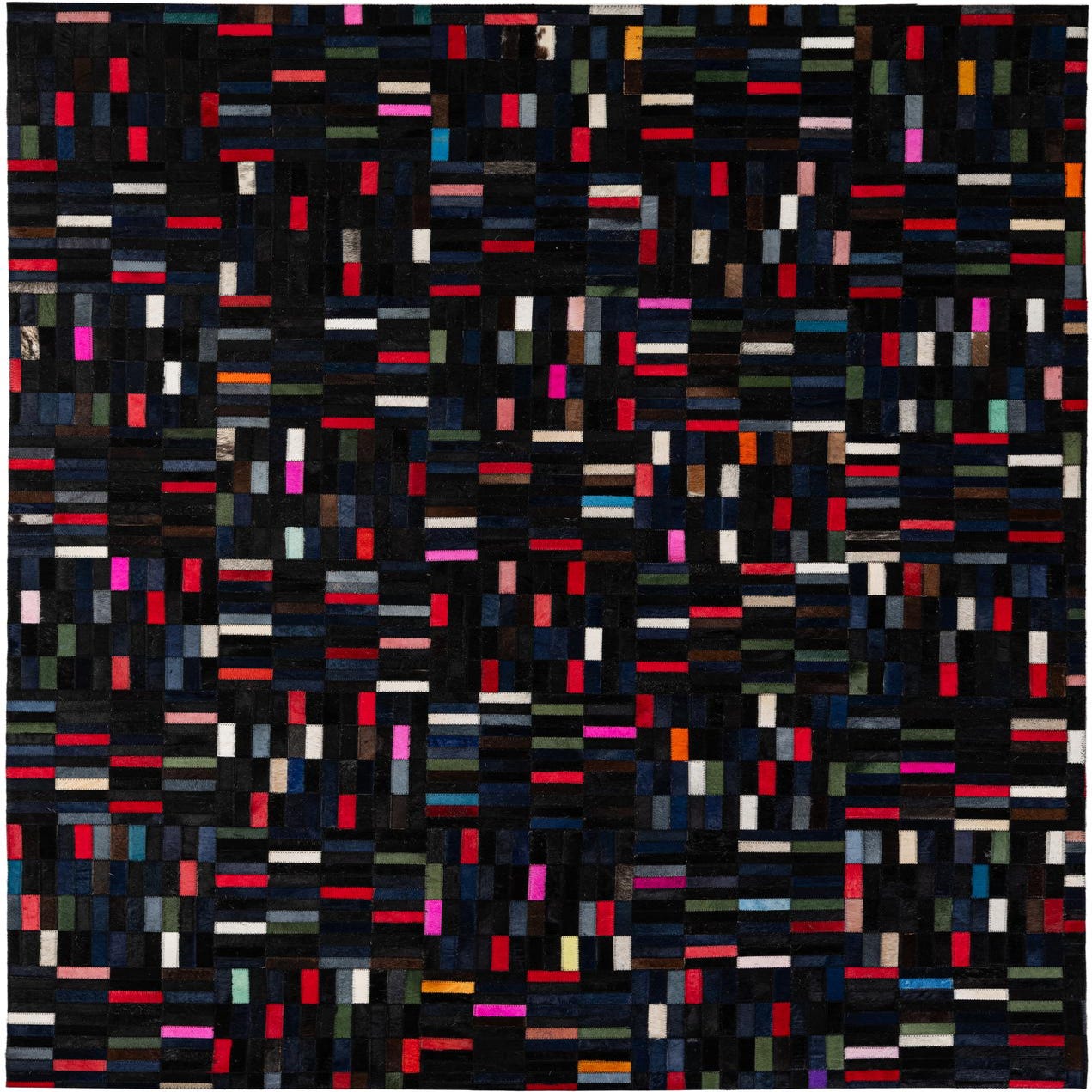A 5x8 rectangular Cowhide Patchwork rug featuring a modern stripe pattern with multi-colored leather pieces on a dark background.