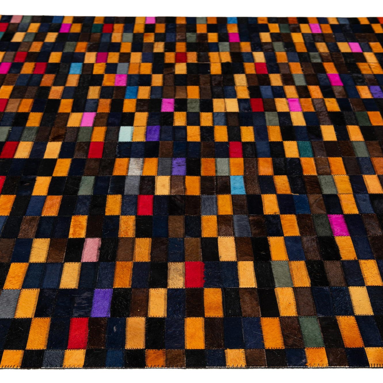 A 5x8 rectangular Cowhide - Patchwork rug featuring a modern pattern of multi-colored rectangular patches, ideal for a living room.