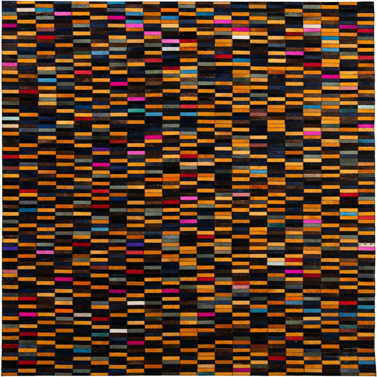 A 5x8 rectangular Cowhide Patchwork rug featuring a modern multi-colored design with various small rectangular patches.