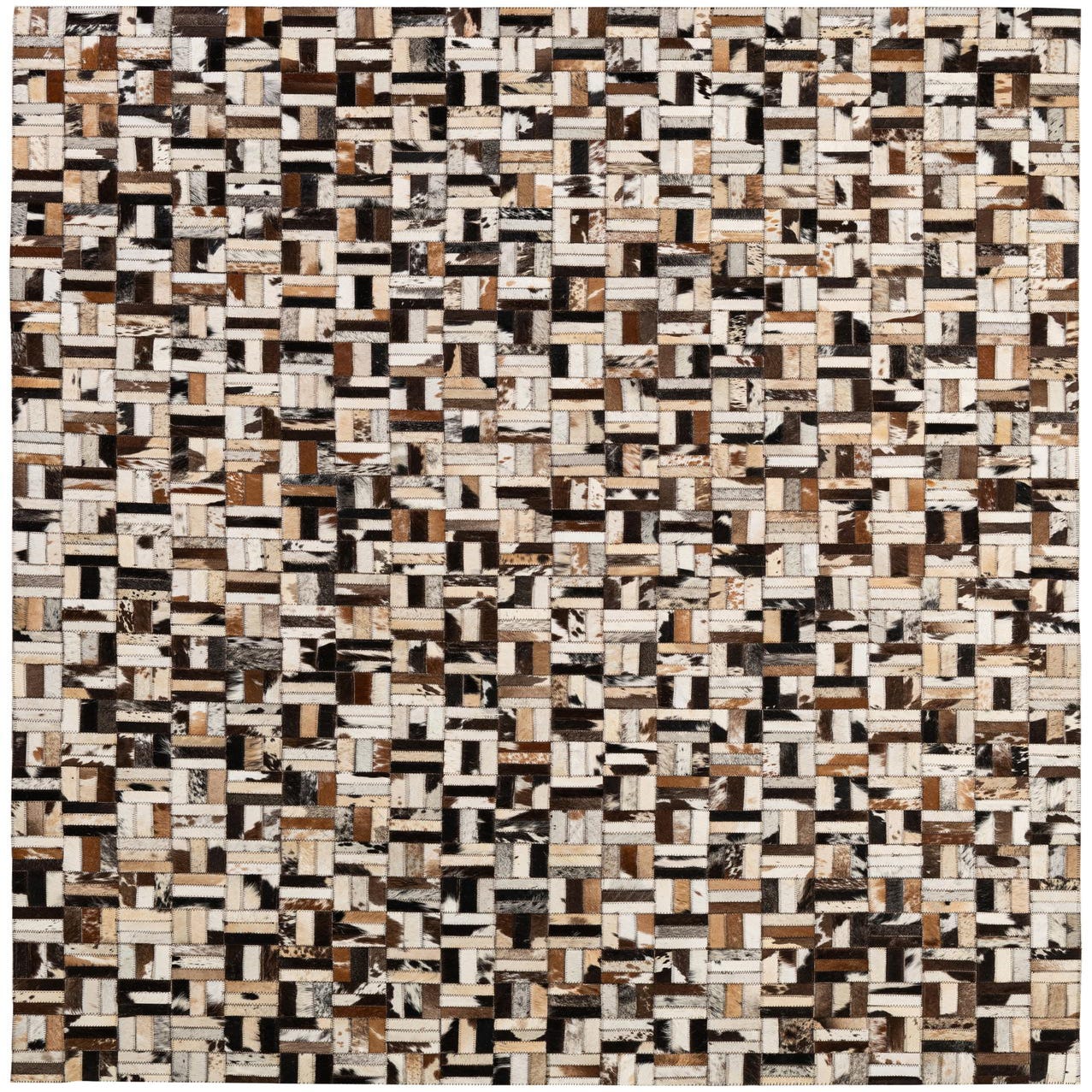 A 5x8 rectangular Cowhide Patchwork rug featuring a modern pattern of multi-colored natural cowhide and leather squares.