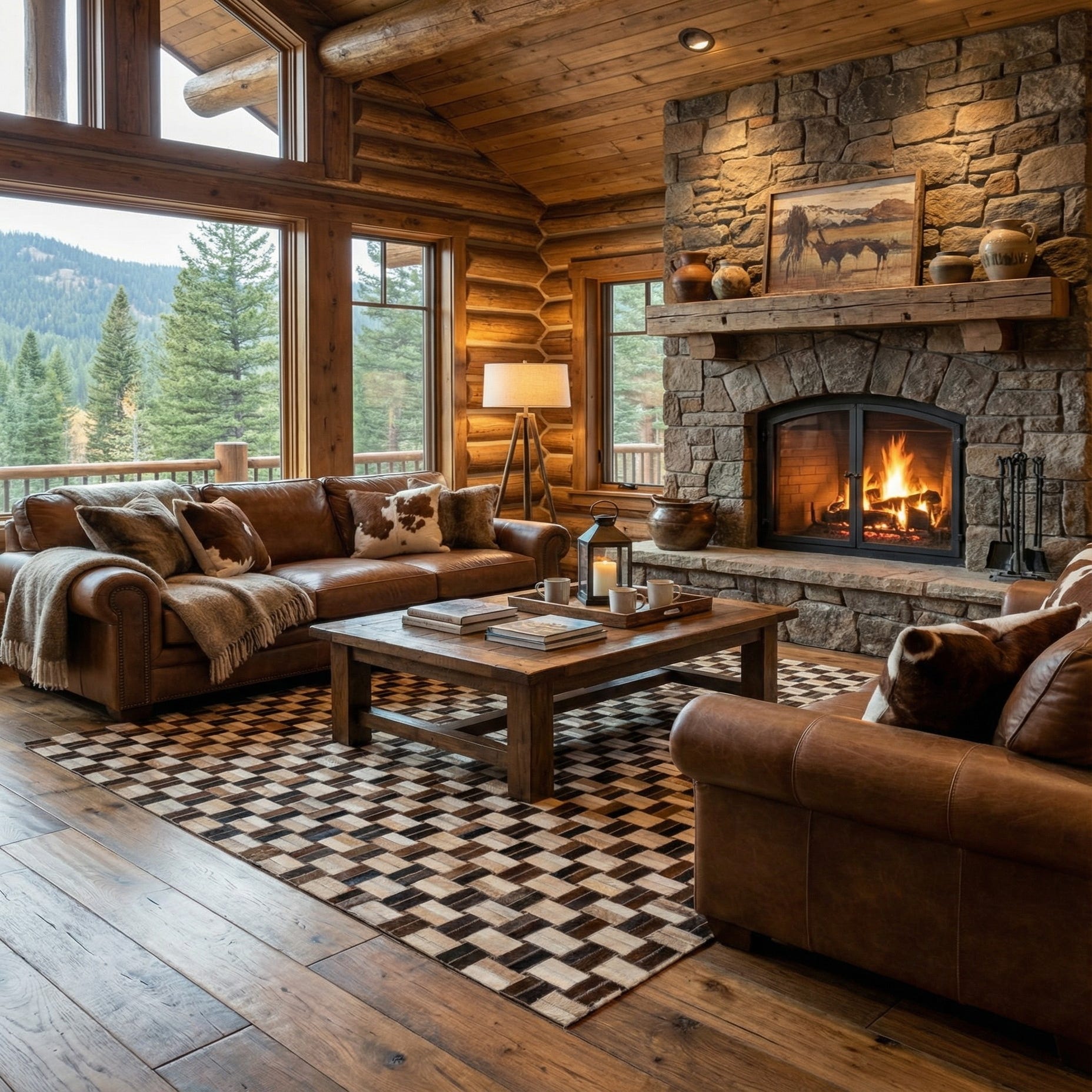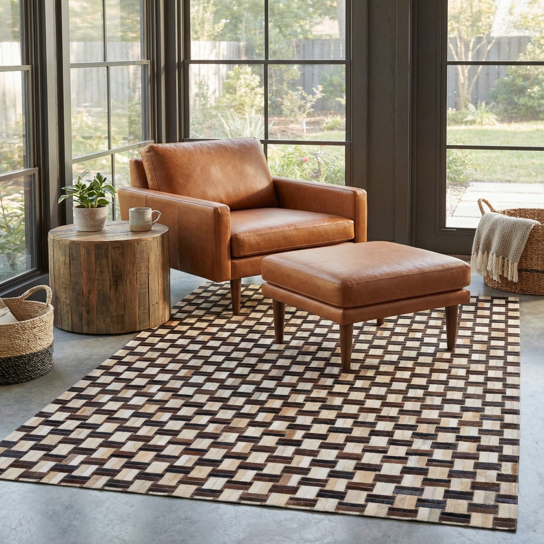 A 5x8 rectangular, multi-colored cowhide patchwork rug with a modern stripe pattern, ideal for a living room.