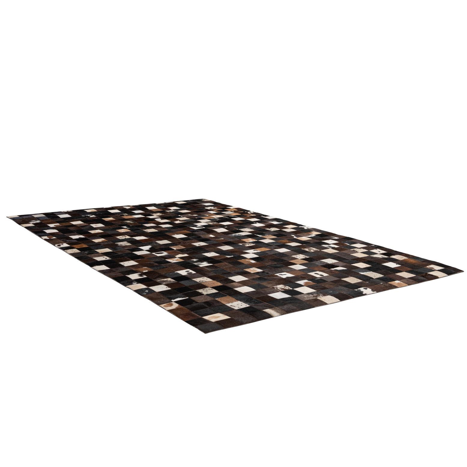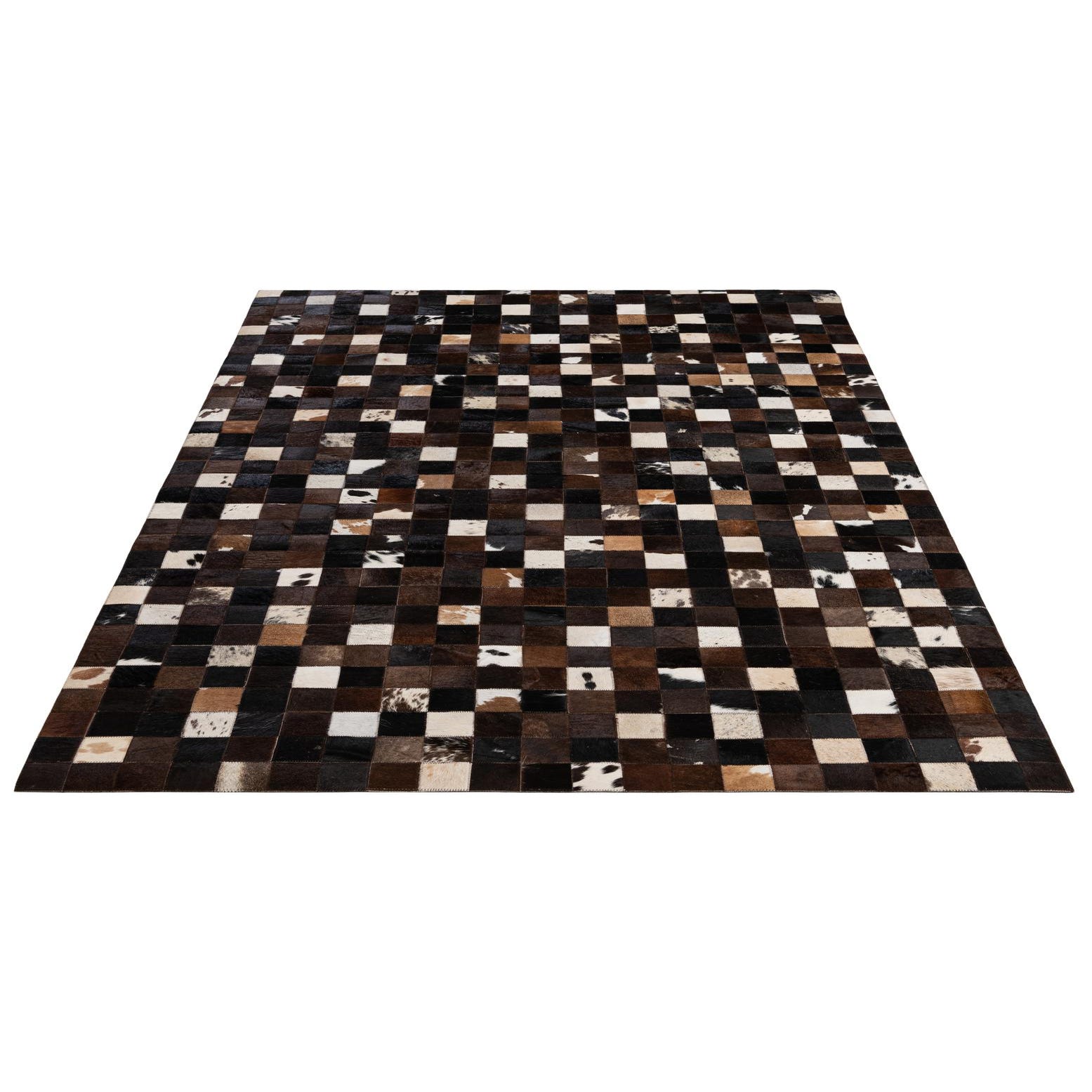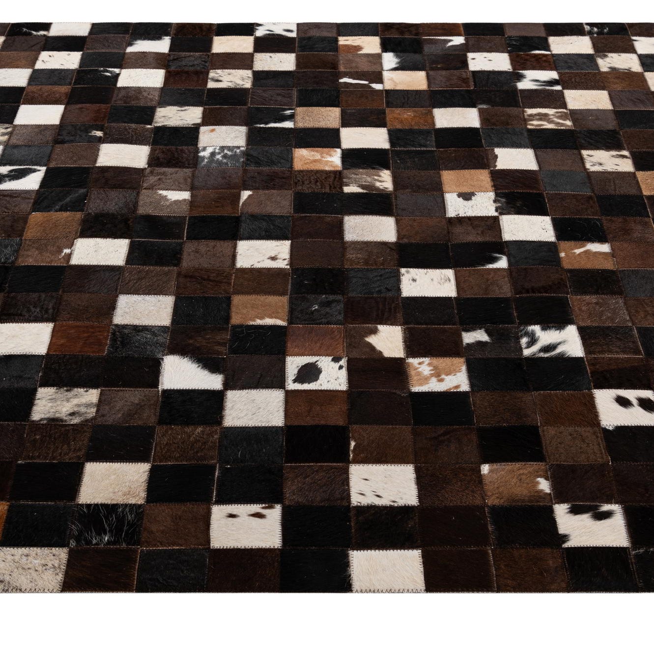 A 5x8 rectangular patchwork cowhide rug featuring a checkerboard pattern of multi-colored squares in black, brown, and white tones.
