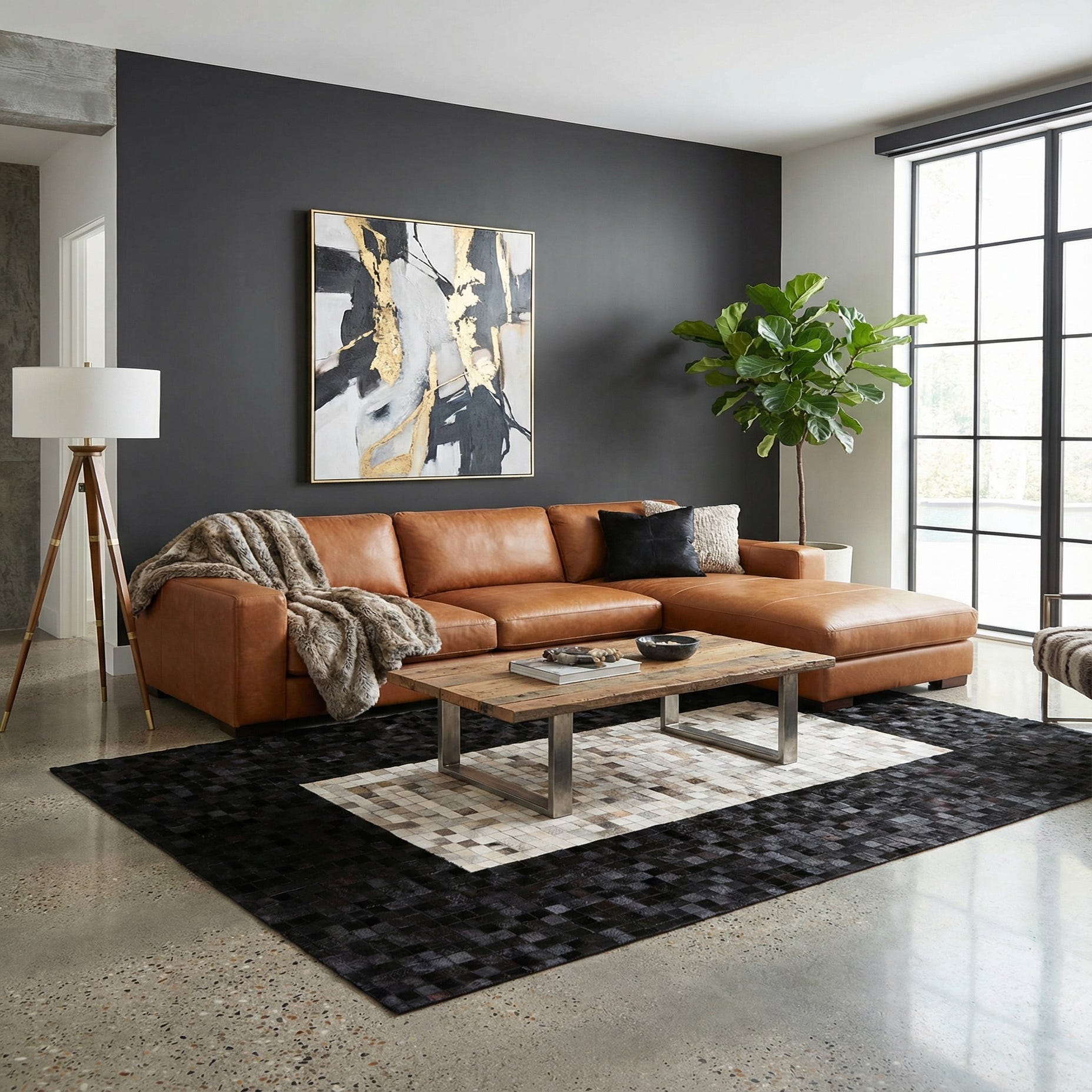 A 5x8 rectangular modern cowhide rug featuring a large black border around a multi-colored patchwork center.