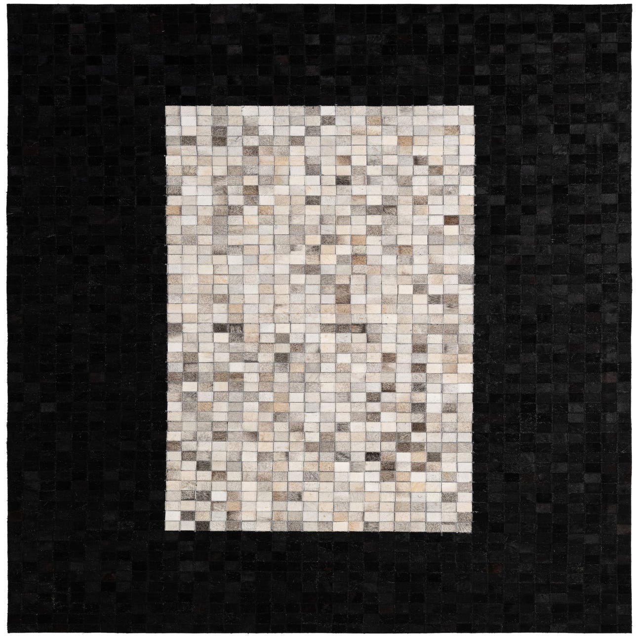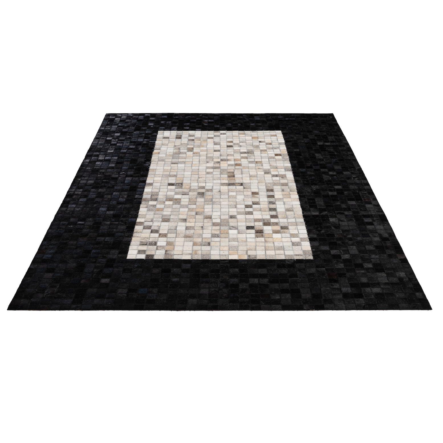 A 5x8 rectangular Cowhide Patchwork rug featuring a multi-colored mosaic center framed by a solid black border.