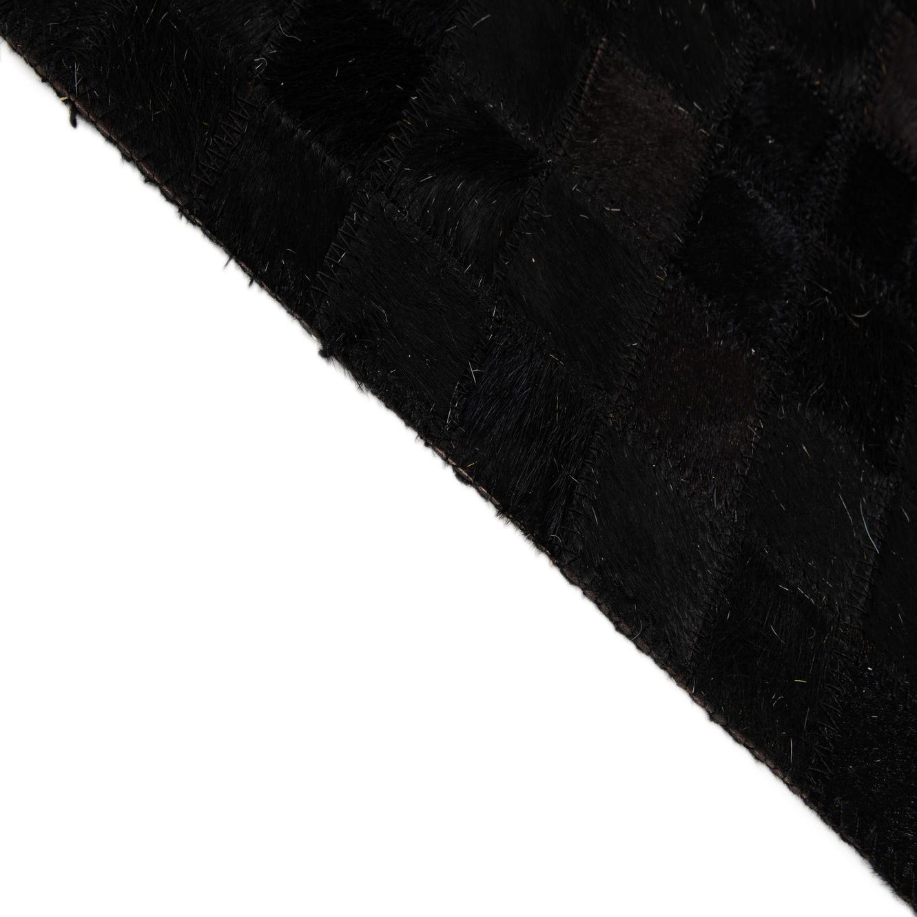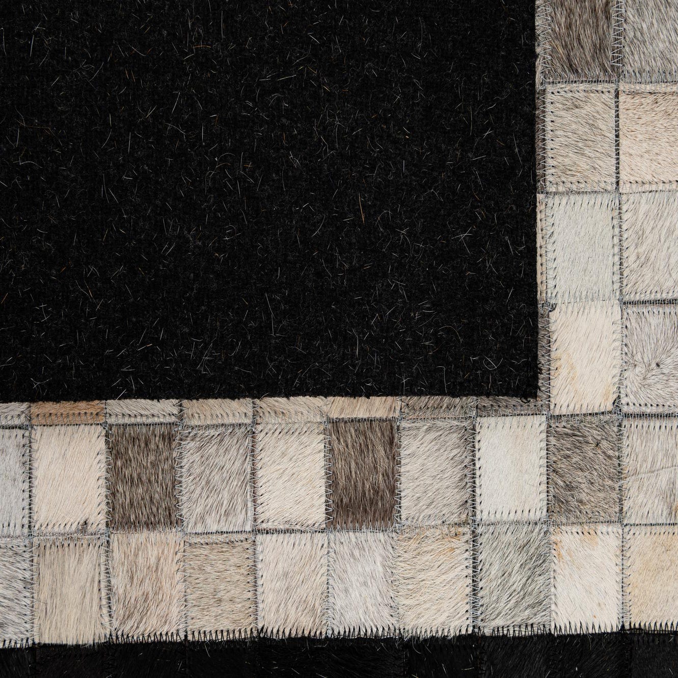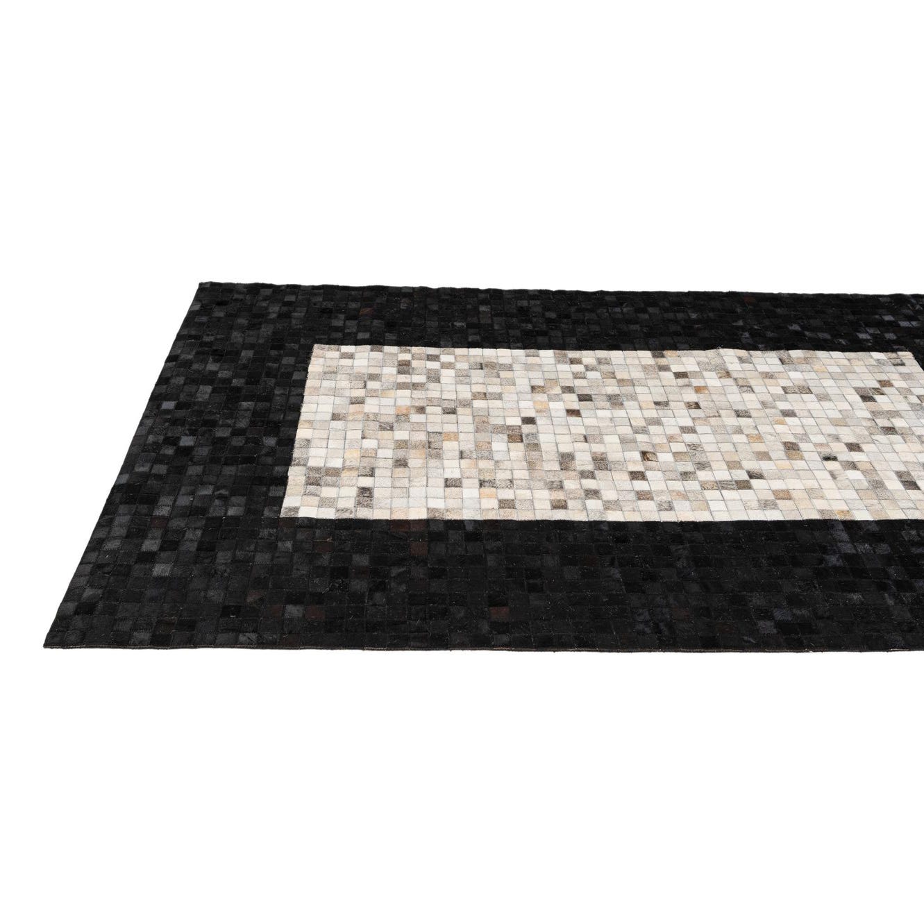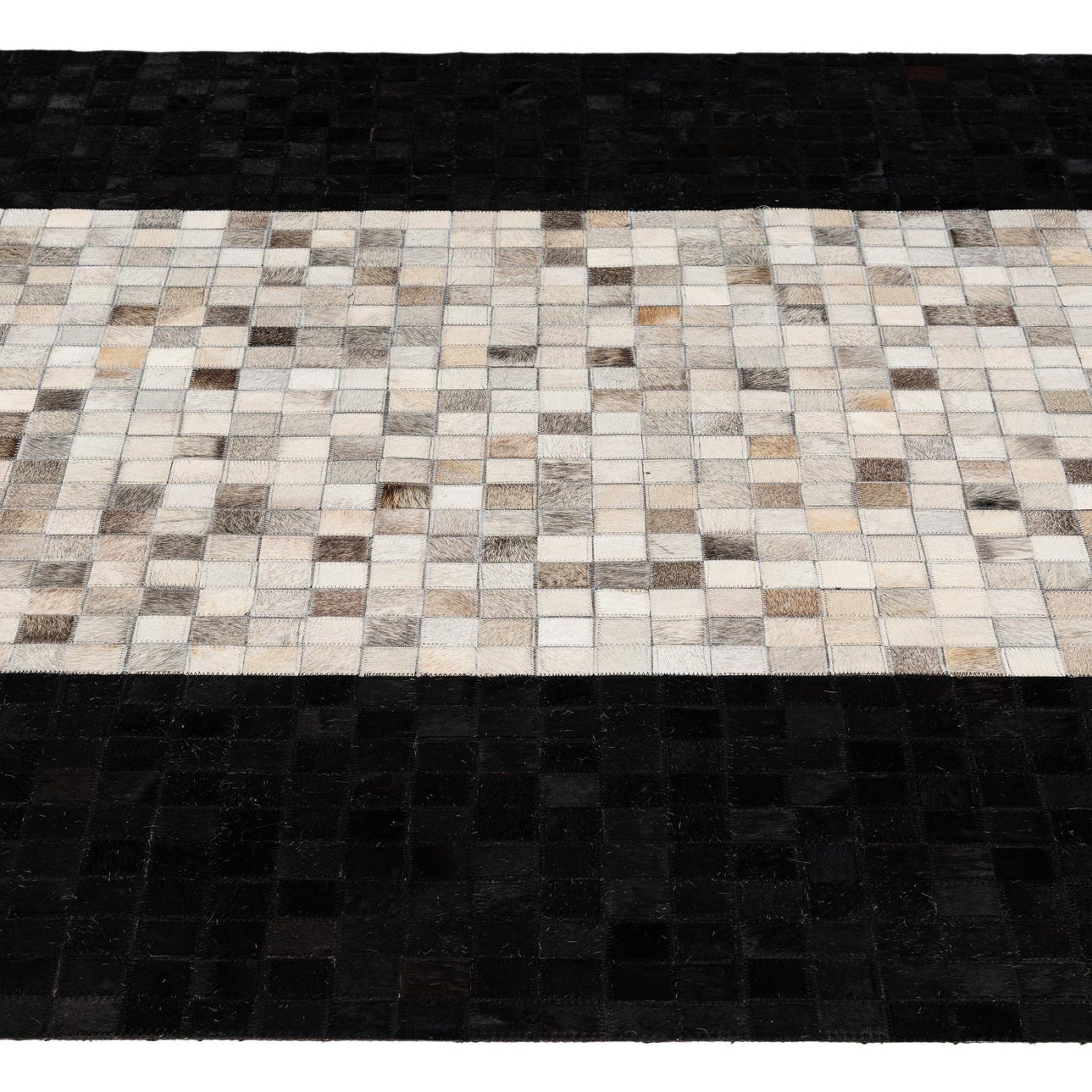 A 5x8 rectangular Cowhide Patchwork rug with a multi-colored square pattern in the center and a solid black border.