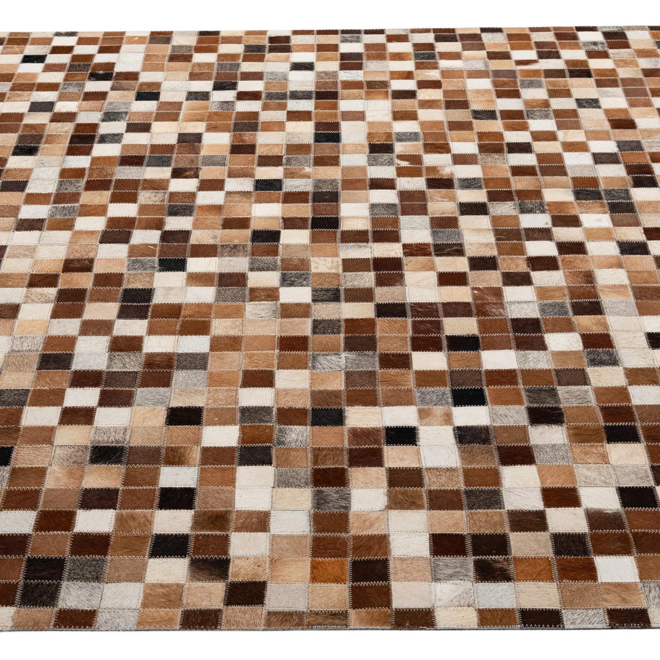 A 5x8 rectangular Cowhide Patchwork rug featuring a modern multi-colored checkerboard pattern in various shades of brown, black, and white.