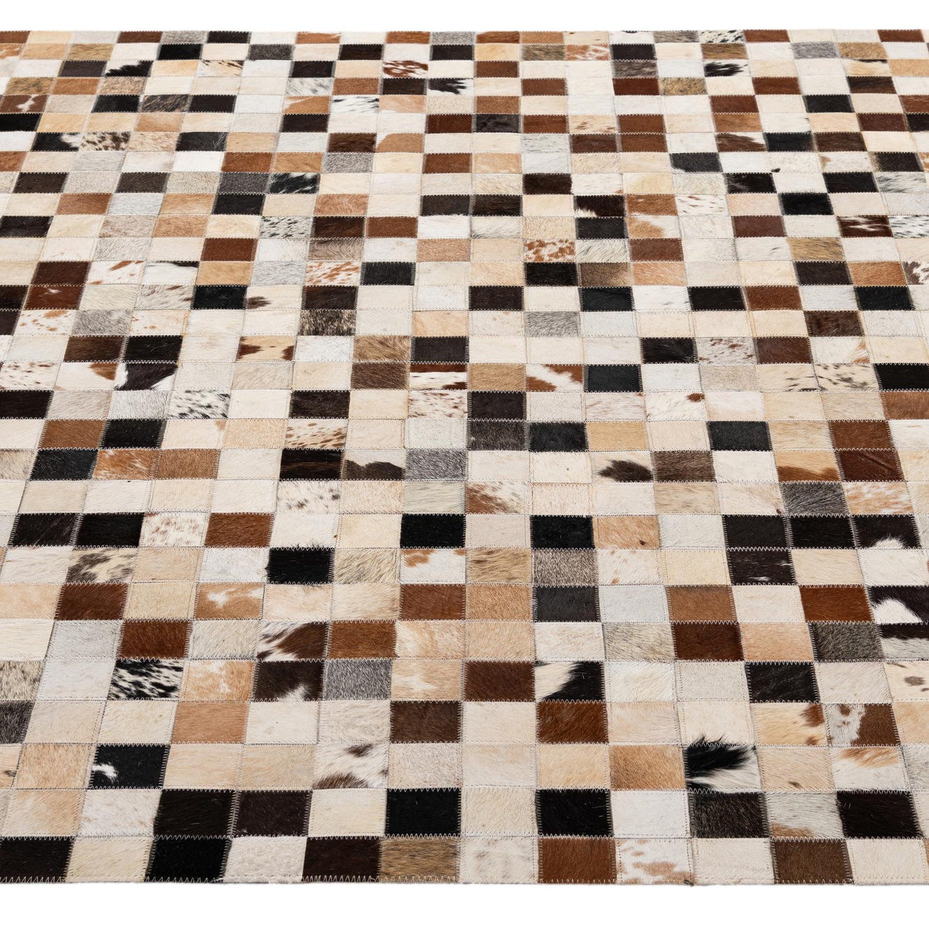 A precise checkerboard of hand-cut cowhide squares creates a warm, tactile surface in a mix of neutrals and dark accents. Cream, ivory, beige, light brown and deeper brown patches sit alongside pockets of black, and the multi-tone background brings the composition together with natural speckling and hair-on texture. Running your hand across the rug reveals the short, smooth nap of cowhide and the subtle sheen and grain of leather at the seams, giving the piece both visual depth and a comfortably grounded feel.