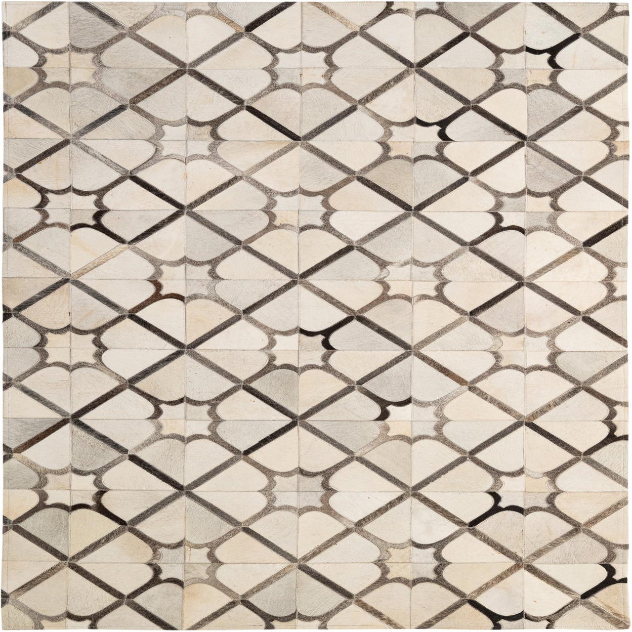A 5x8 rectangular Cowhide - Patchwork rug featuring a modern geometric pattern in multi-colored natural cowhide and leather.