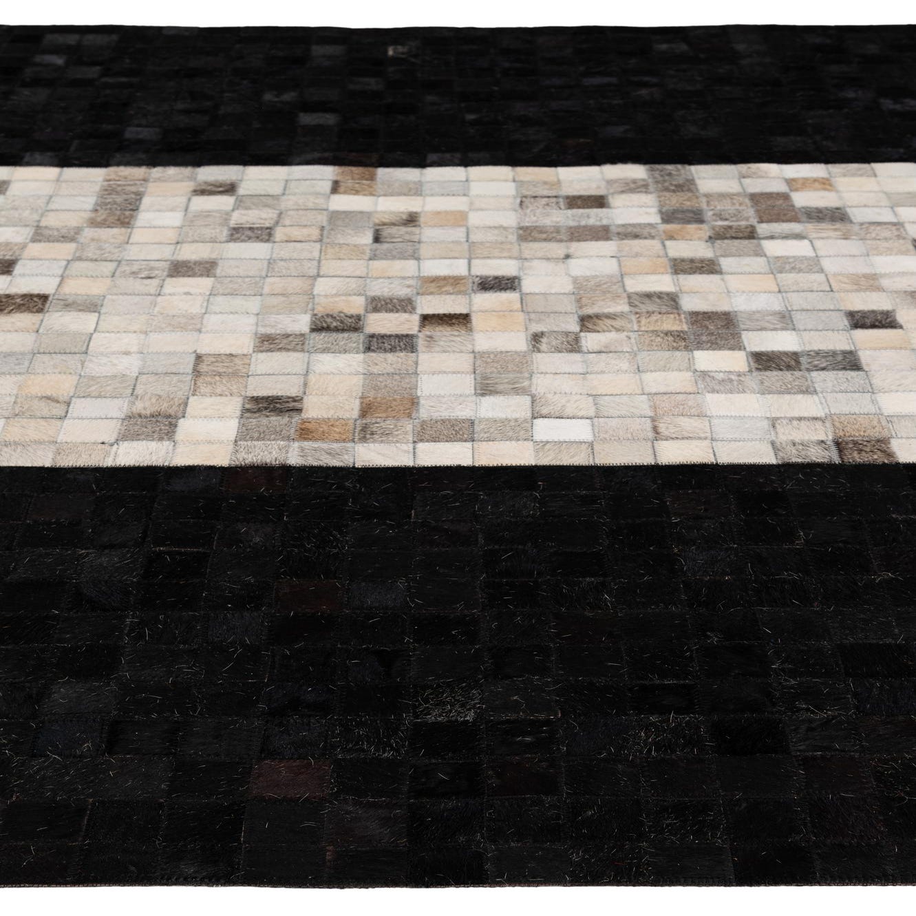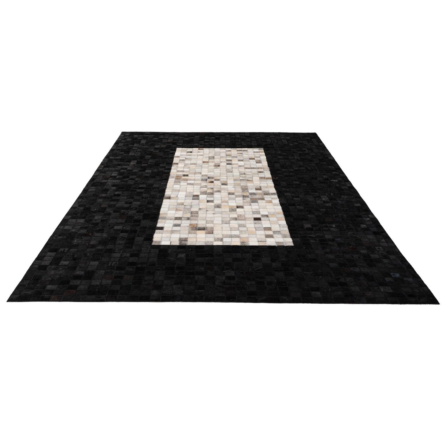 A 5x8 rectangular modern rug featuring a central multi-colored patchwork of cowhide squares, framed by a solid black cowhide border.