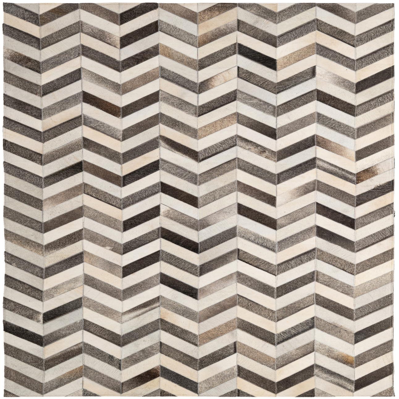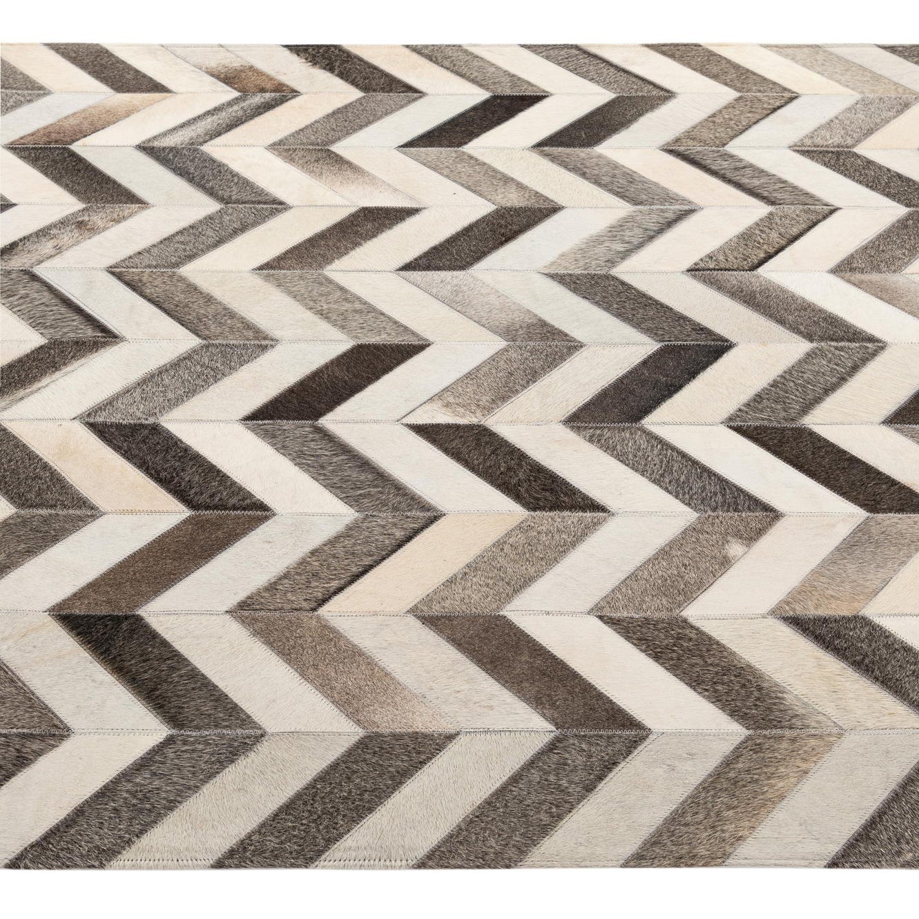 A 5x8 rectangular cowhide rug featuring a modern chevron pattern in various shades of brown, gray, and cream.