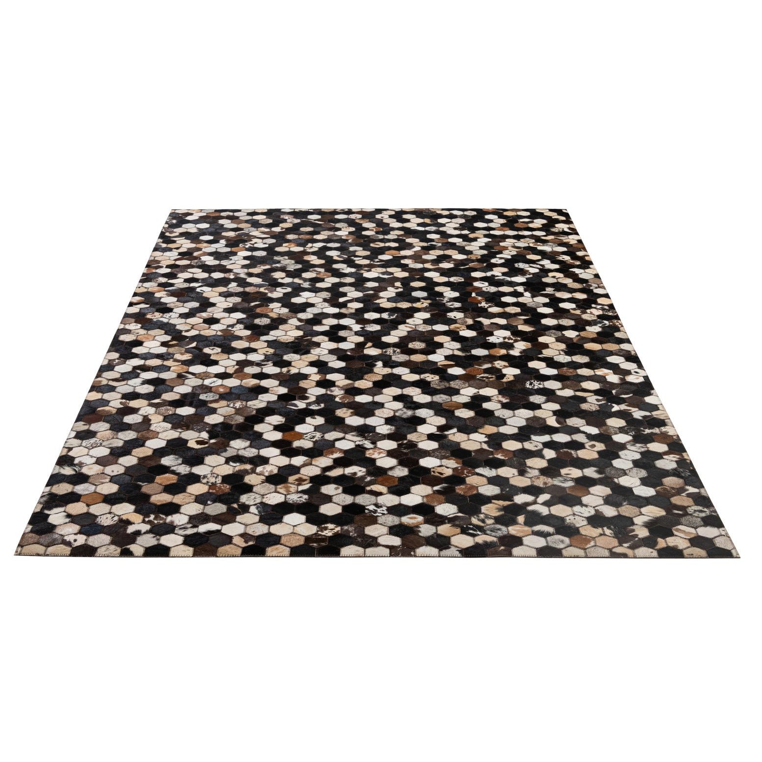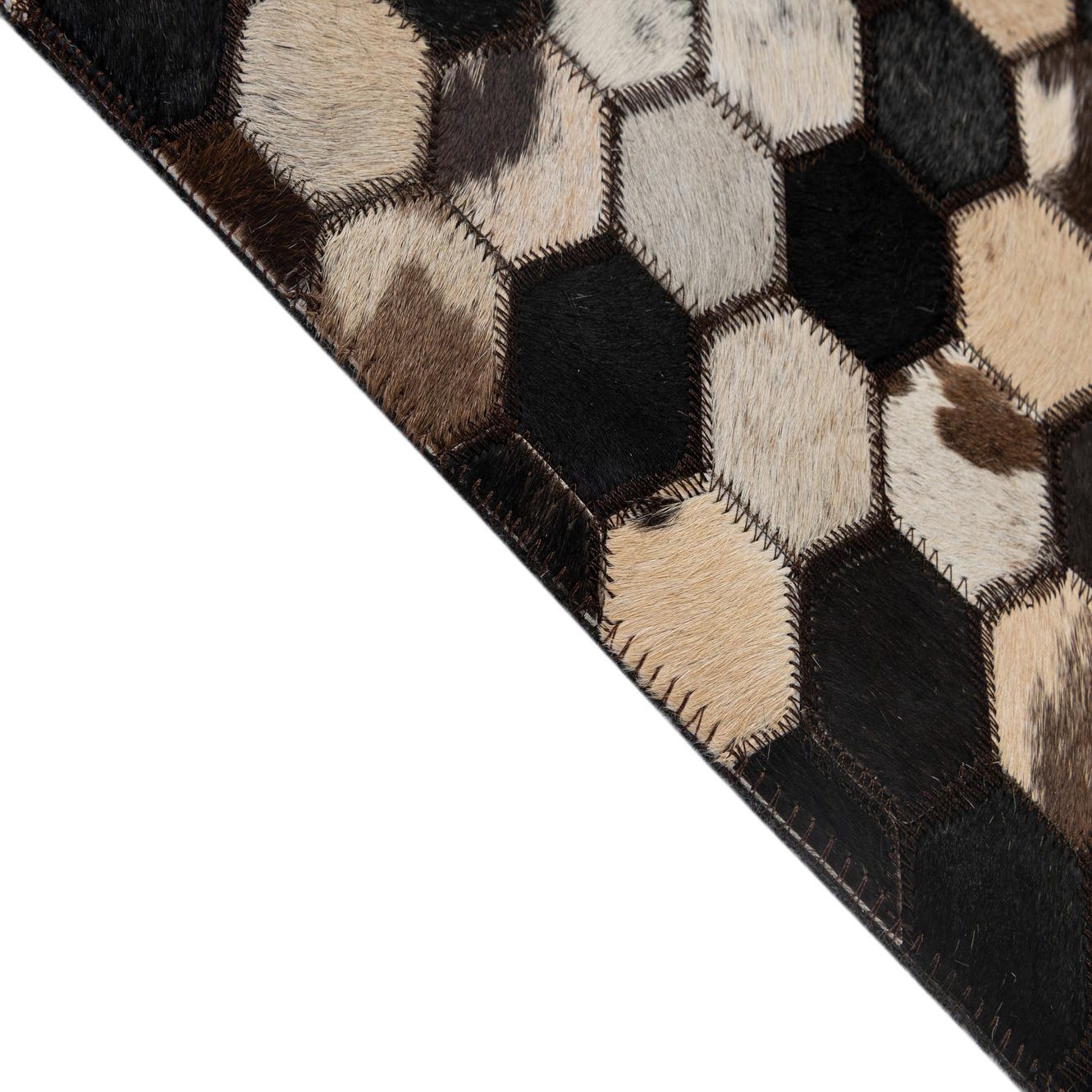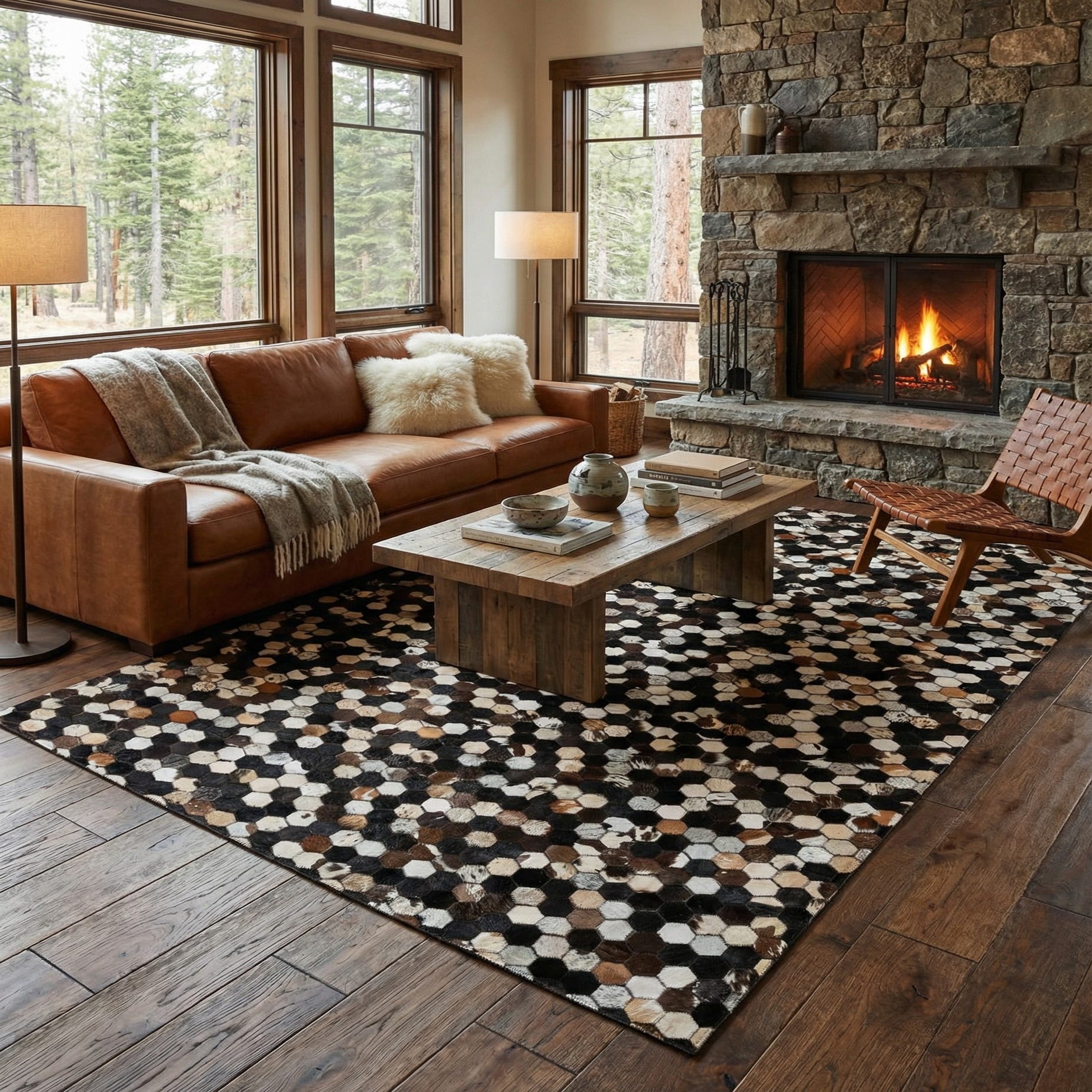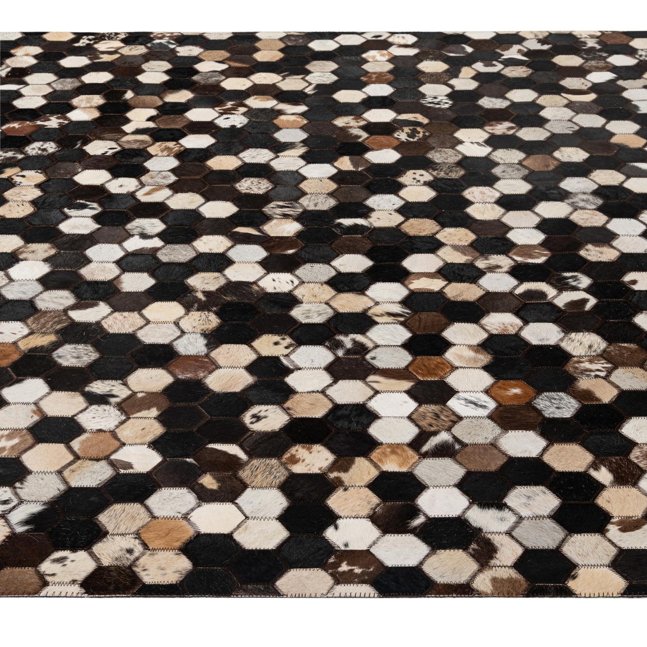 A rectangular 5x8 cowhide rug with a modern patchwork pattern of multi-colored hexagonal leather pieces, ideal for a living room.
