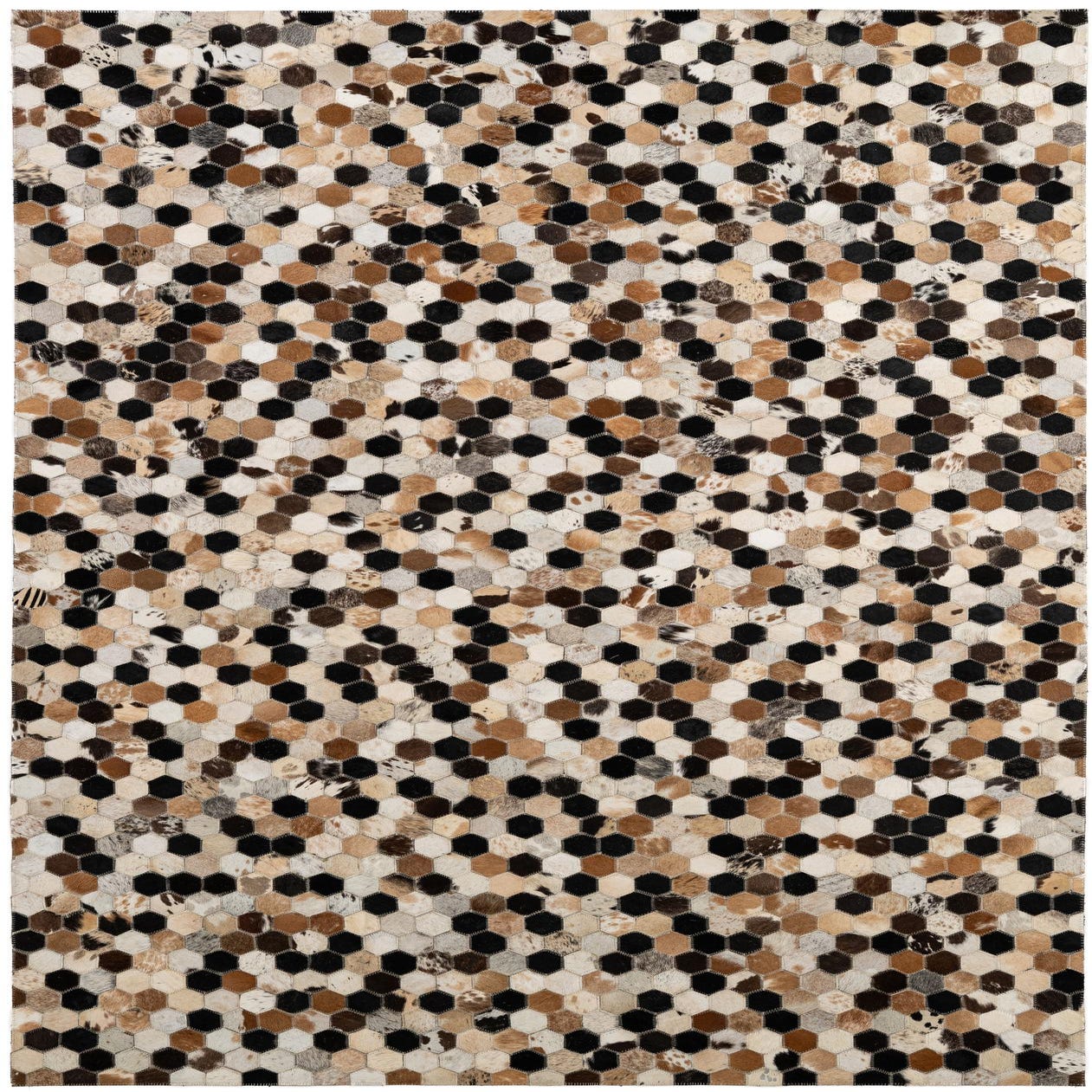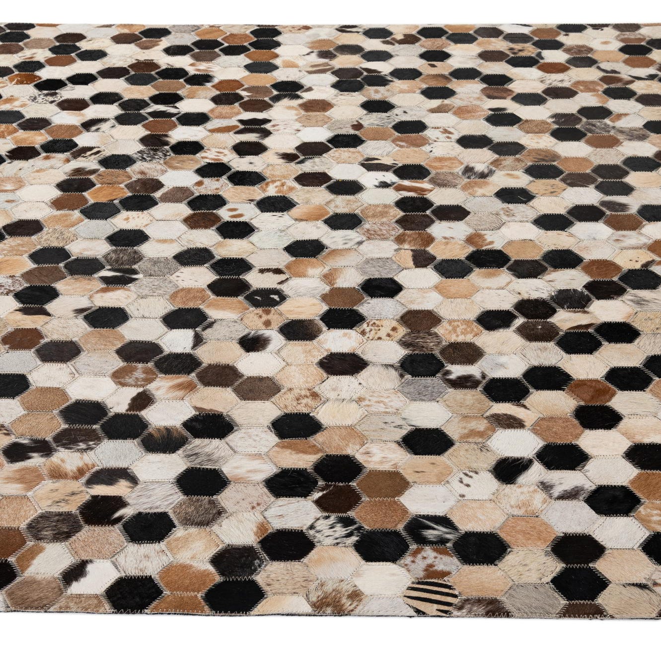 Handmade from cowhide and leather, this rug is assembled from hundreds of small hexagonal patches that form a honeycomb-like patchwork. The hair-on hide surface offers a soft, tactile nap with a subtle leather sheen and visible stitch lines that add gentle texture underfoot. A multi background weaves together tones of beige, cream, ivory, light brown, brown, gray and black, with natural mottling and speckling in each patch that gives the overall pattern depth and movement without overwhelming the space.