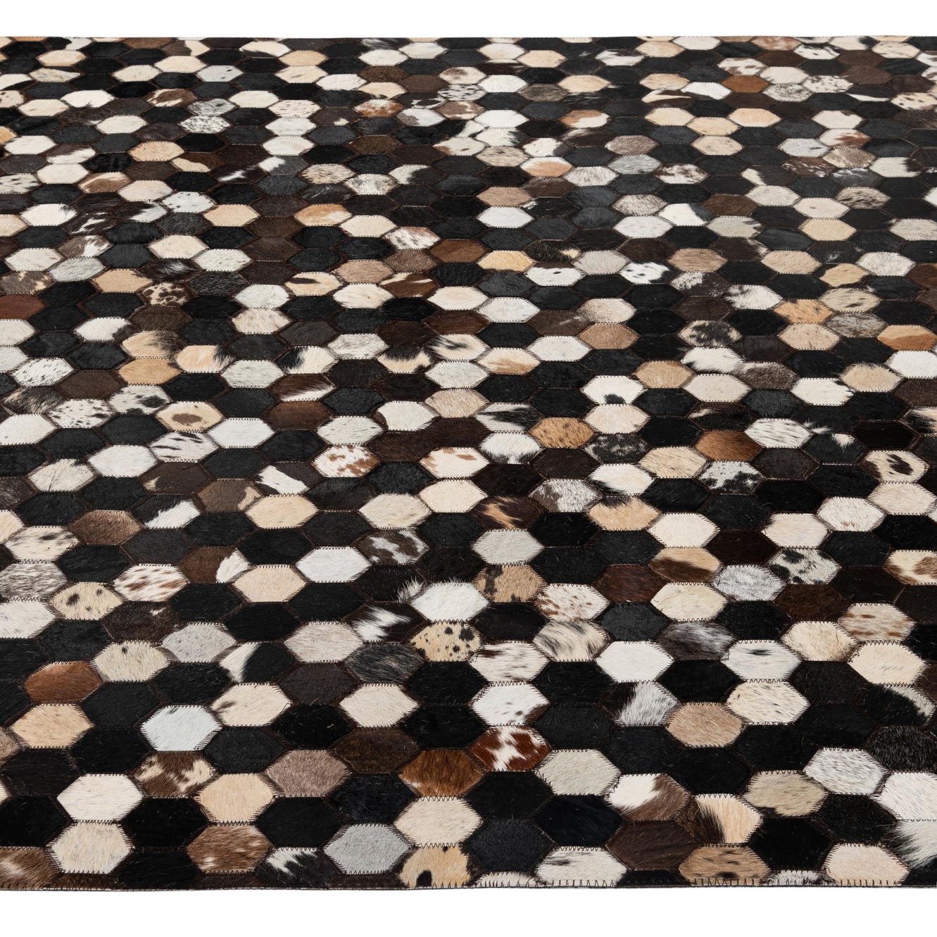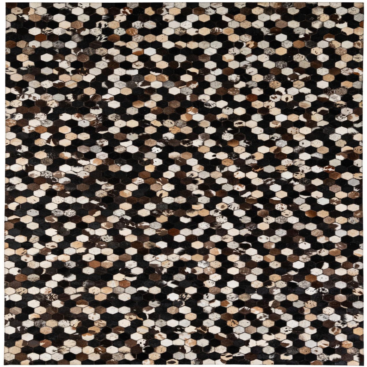 A 5x8 rectangular Cowhide Patchwork rug featuring a modern geometric pattern of multi-colored hexagonal leather and cowhide pieces in shades of black, brown, and cream.