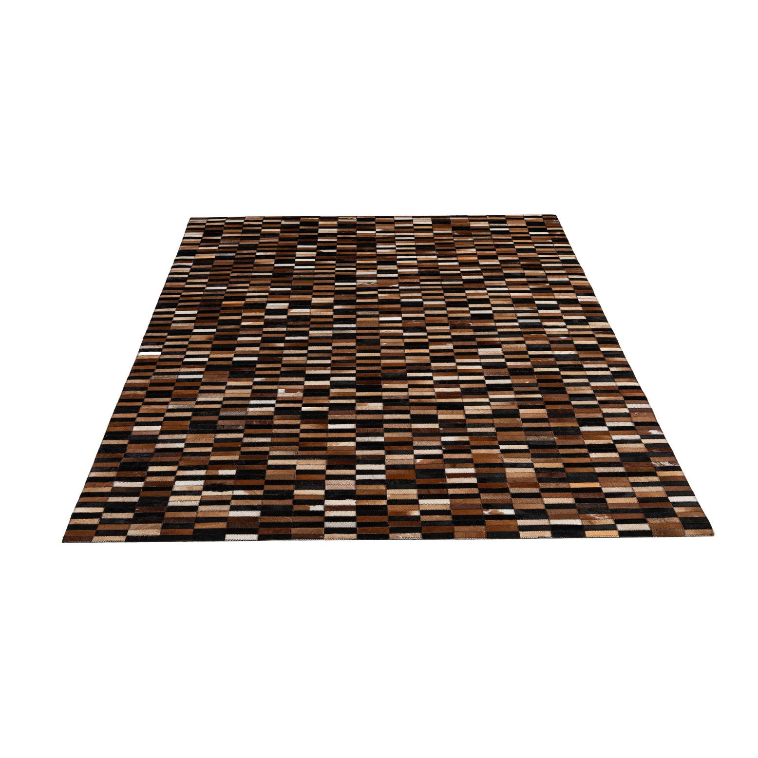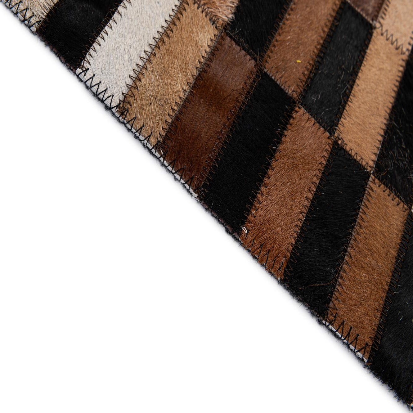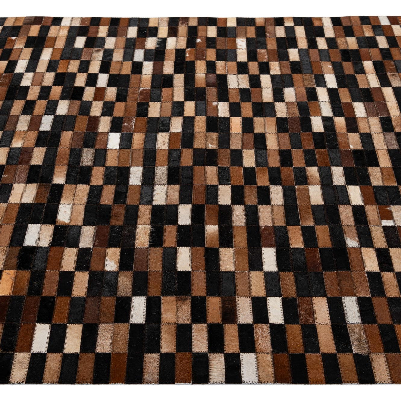 A 5x8 rectangular Cowhide Patchwork rug featuring a modern geometric pattern of multi-colored brown, black, and white leather squares.