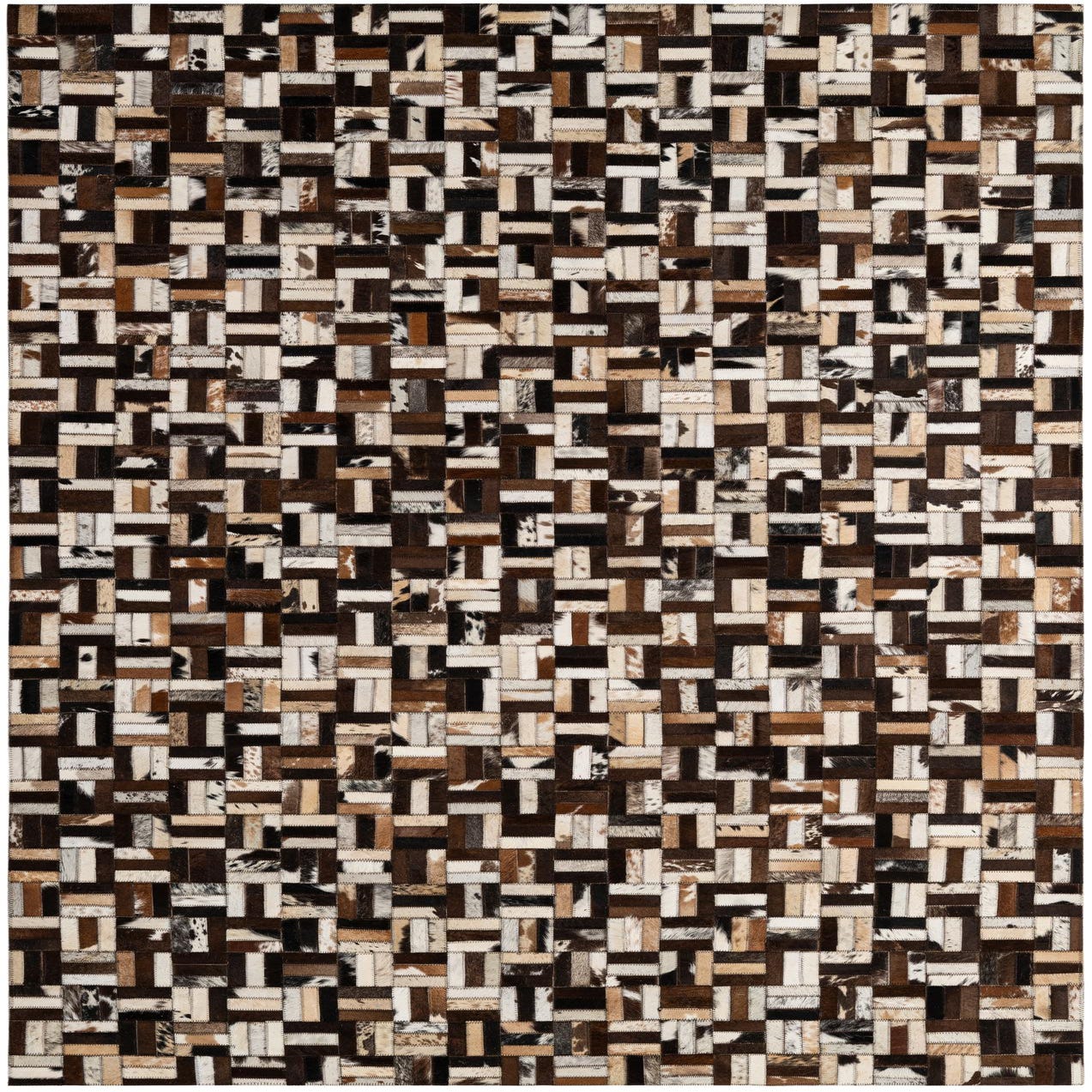 A 5x8 rectangular Cowhide Patchwork rug featuring a modern pattern of multi-colored natural cowhide and leather squares.