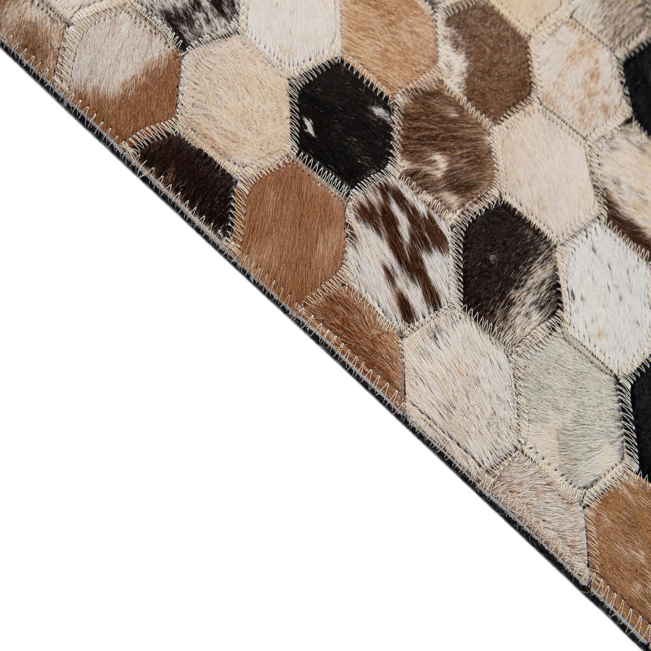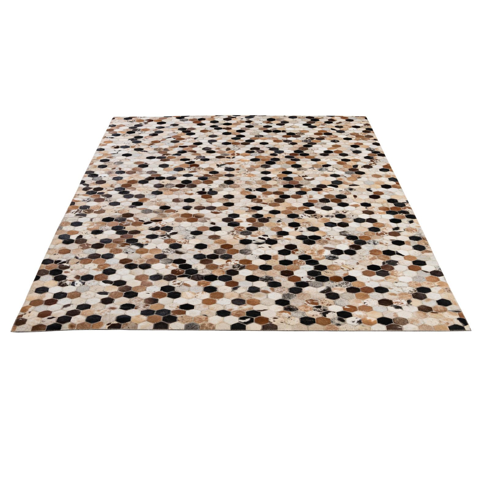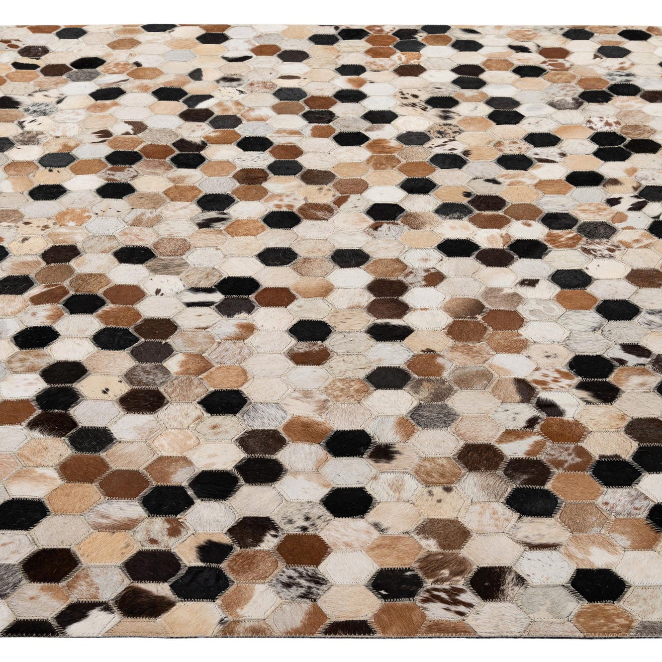 A 5x8 rectangular Cowhide - Patchwork rug featuring a modern hexagonal pattern in multi-colored natural cowhide and leather tones, suitable for various indoor rooms.