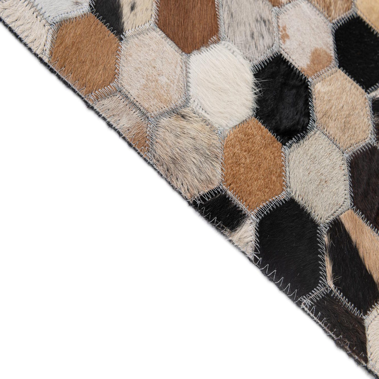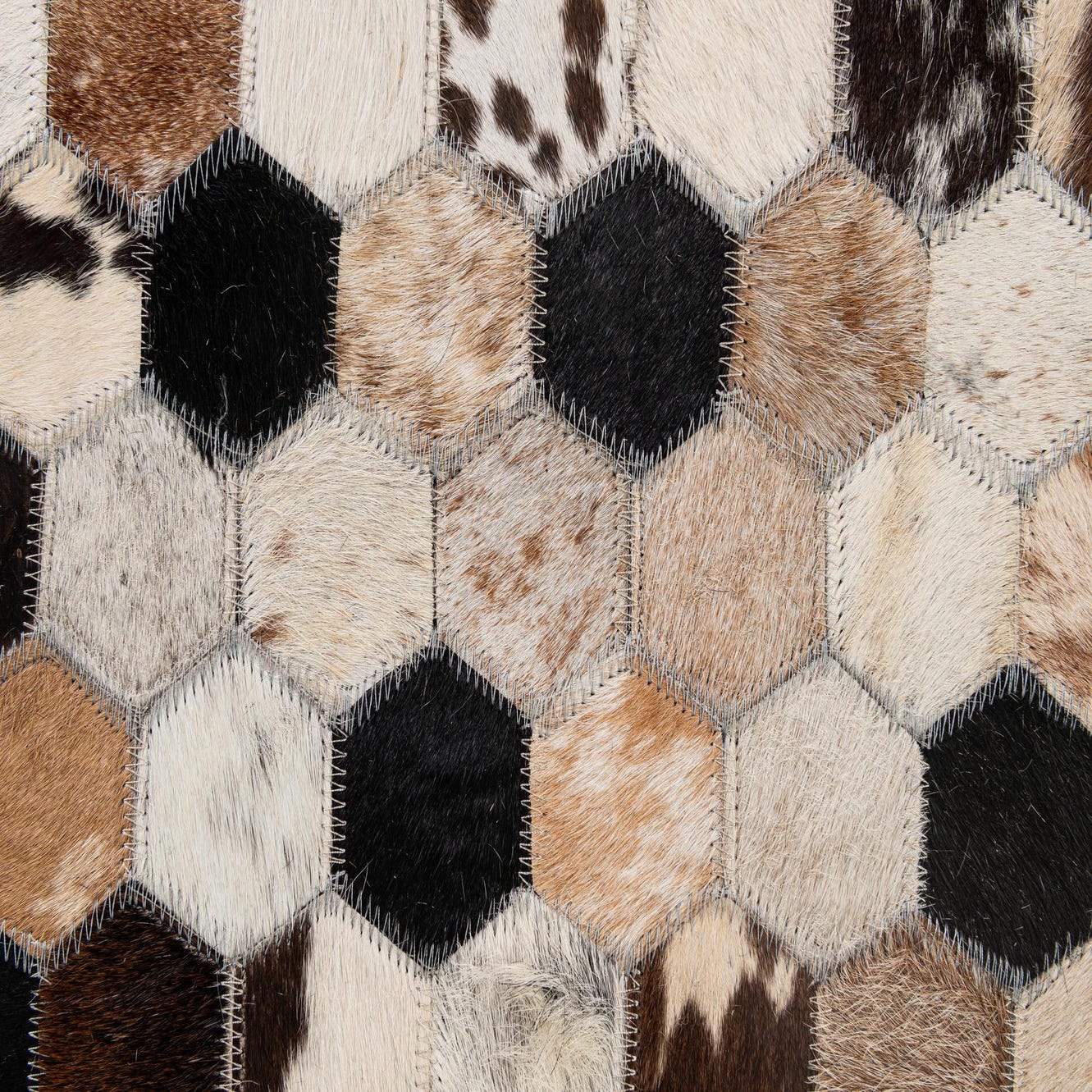 A 5x8 rectangular Cowhide - Patchwork rug featuring a modern hexagonal pattern in multi-colored natural cowhide and black.