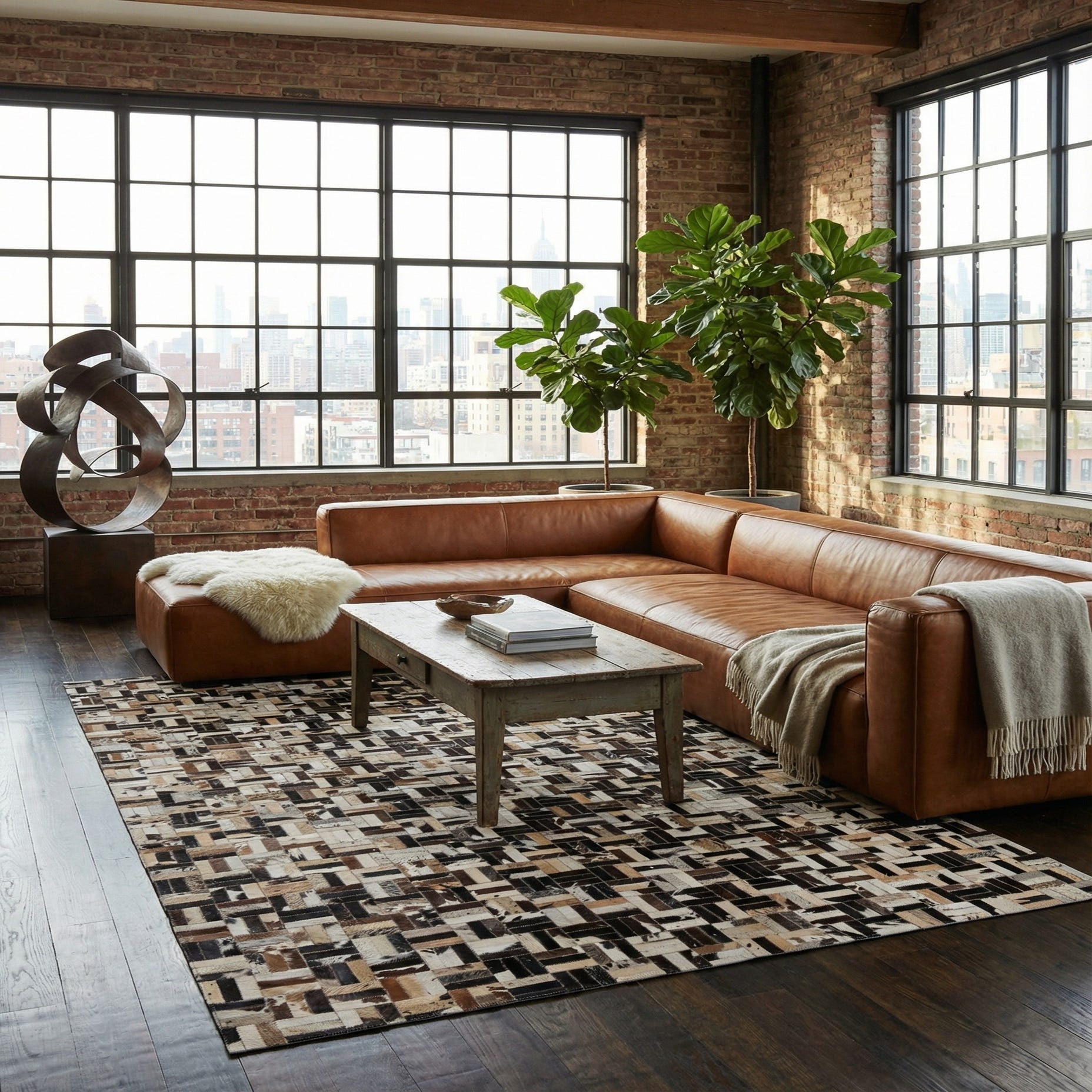 A 5x8 rectangular Cowhide Patchwork rug featuring a modern stripe pattern in multi-colored brown, black, and white tones.