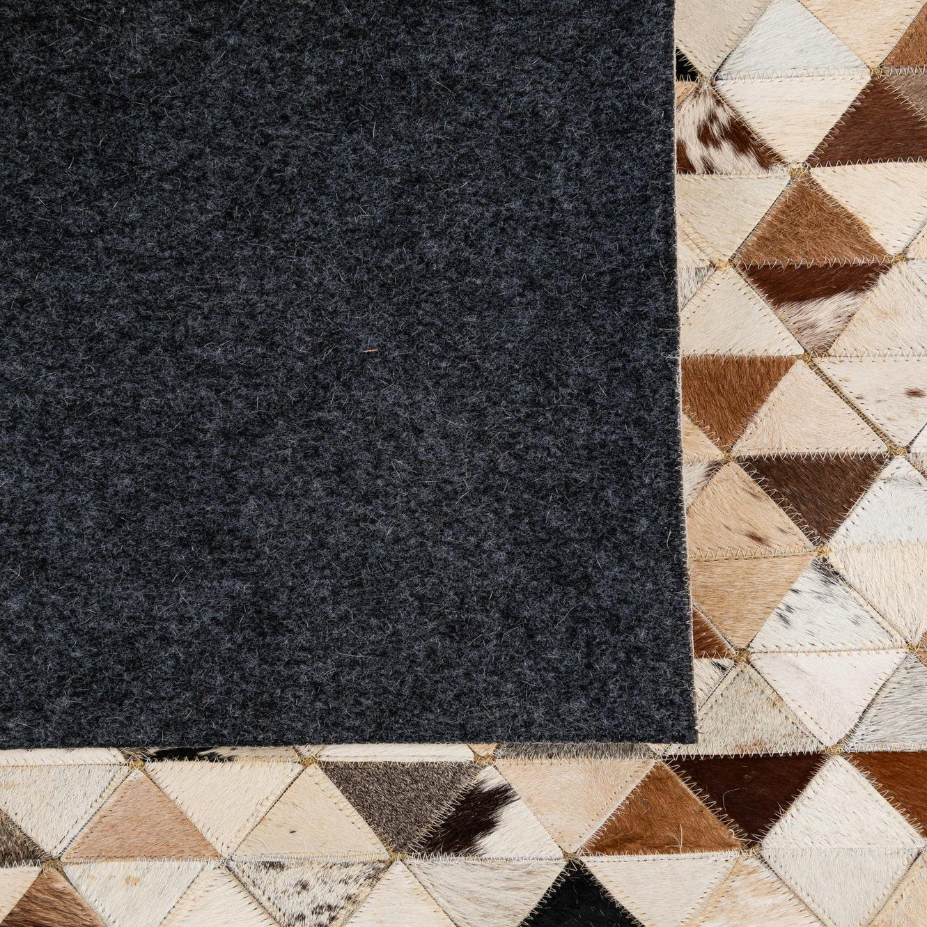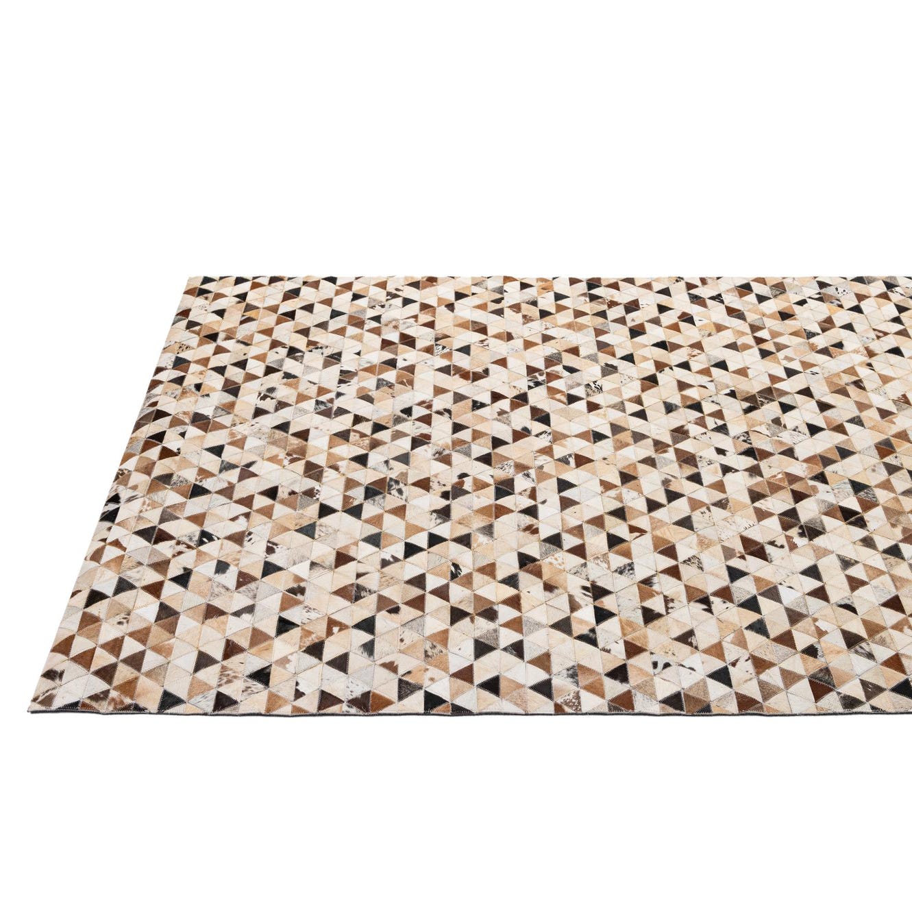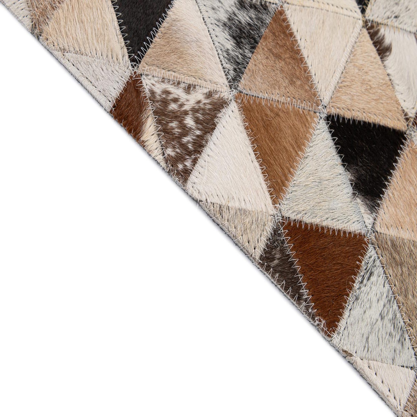 A 5x8 rectangular Cowhide - Patchwork rug featuring a modern geometric pattern of multi-colored natural cowhide and leather triangles.