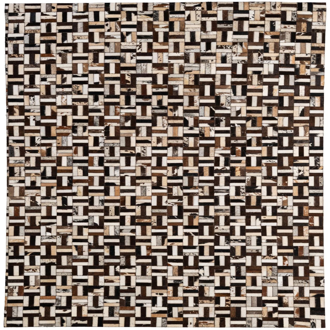 A 5x8 rectangular Cowhide Patchwork rug featuring a modern stripe pattern in multi-colored brown, black, and white tones.