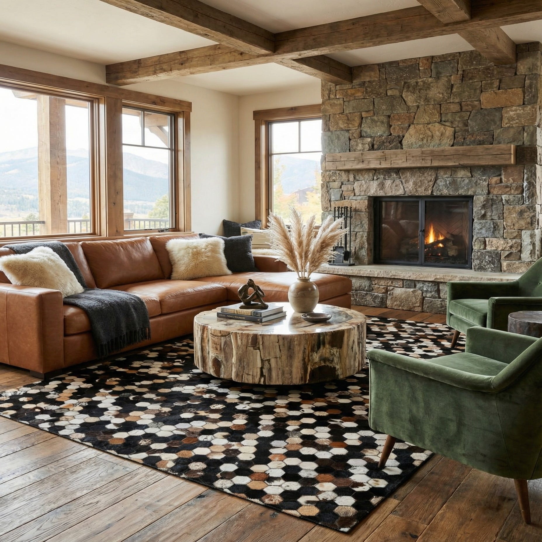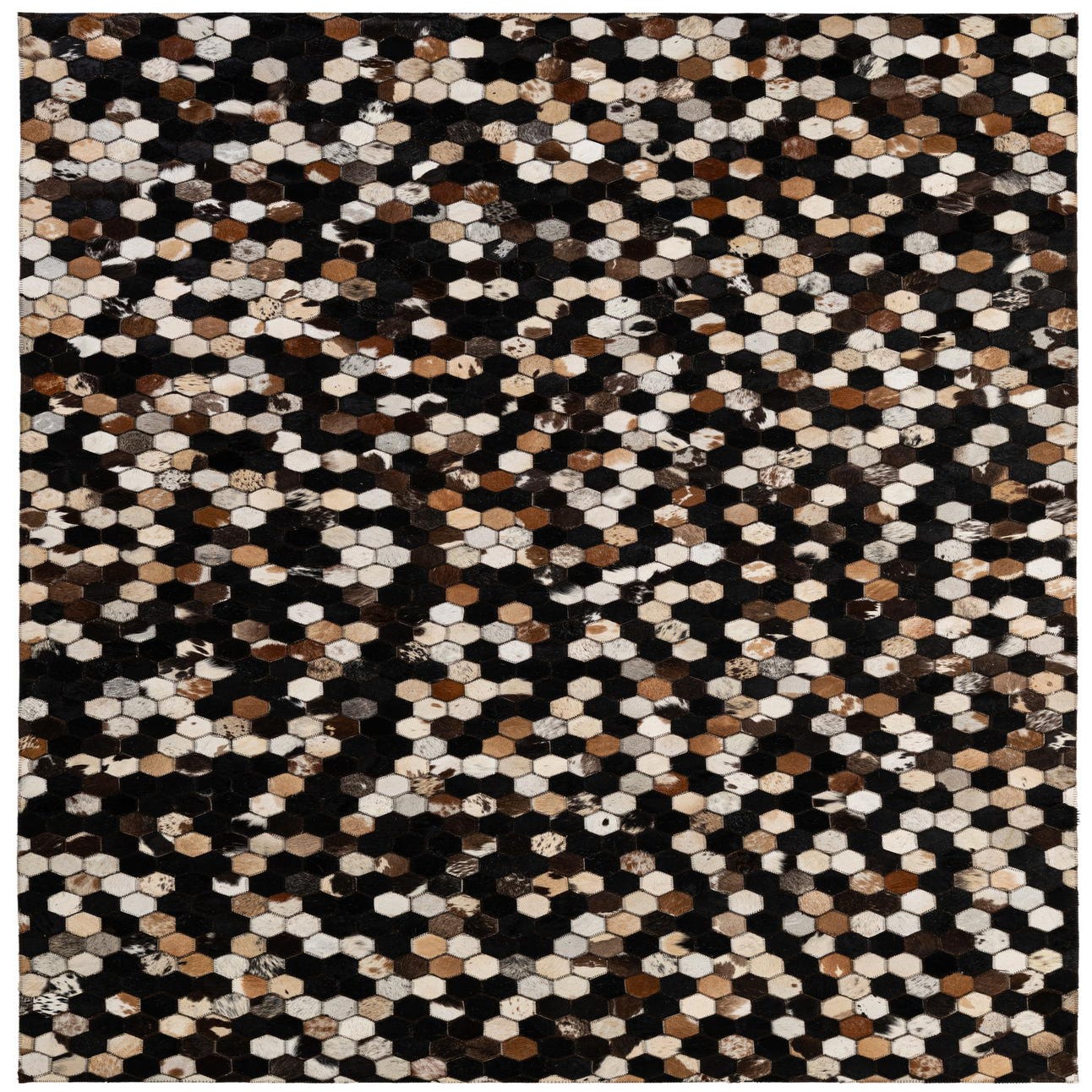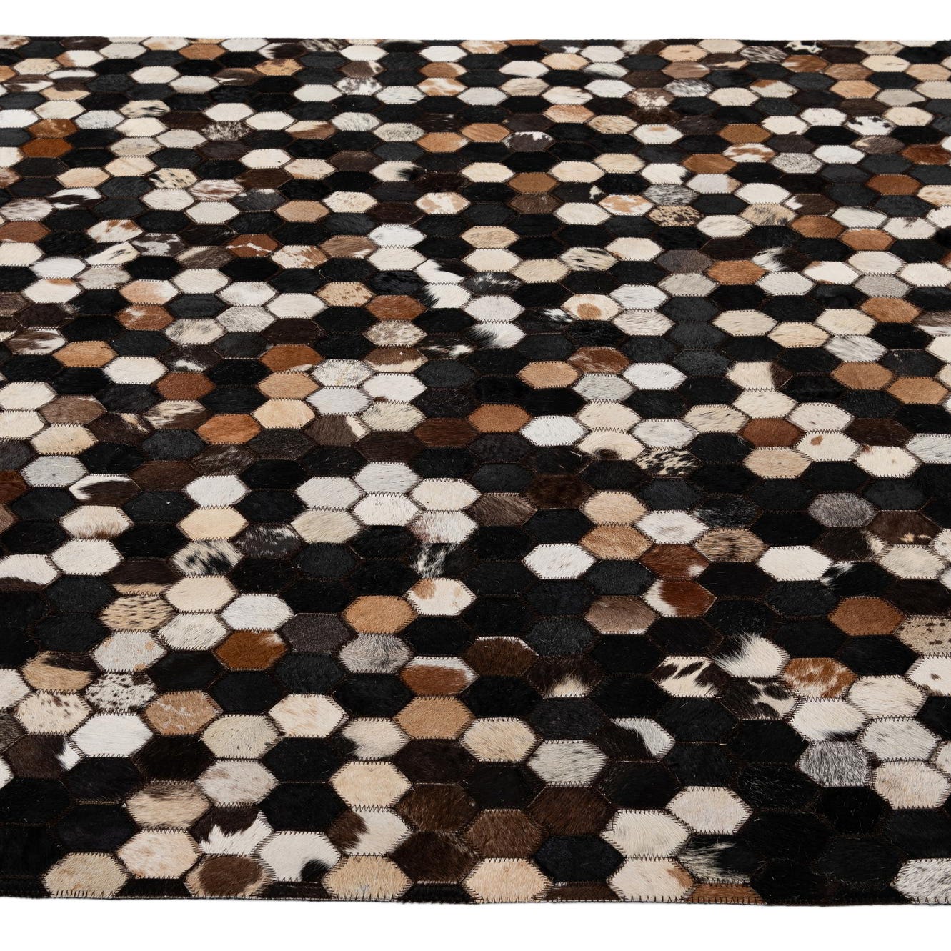 A rectangular 5x8 modern Cowhide & Leather rug featuring a multi-colored hexagonal patchwork pattern in black, brown, and white tones.