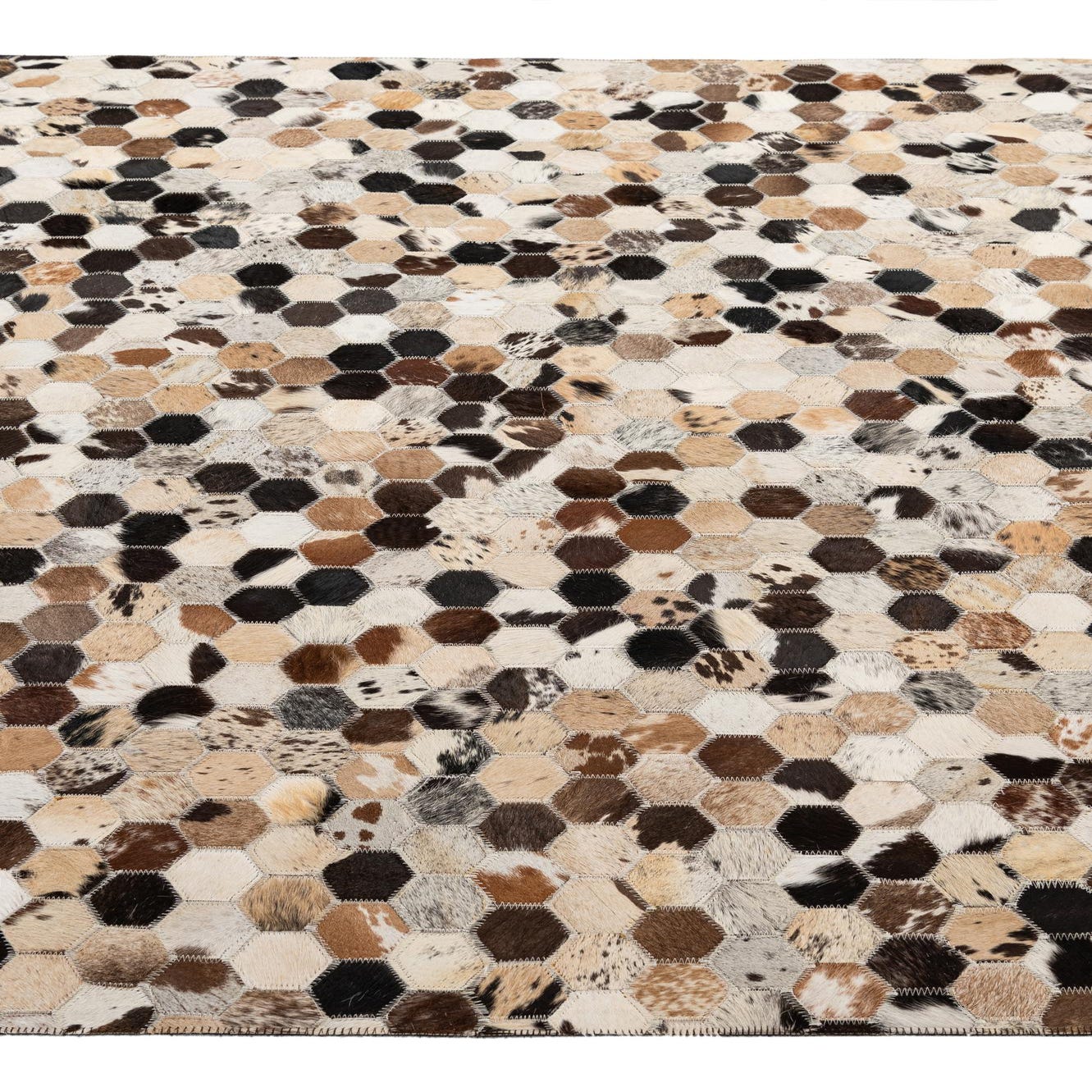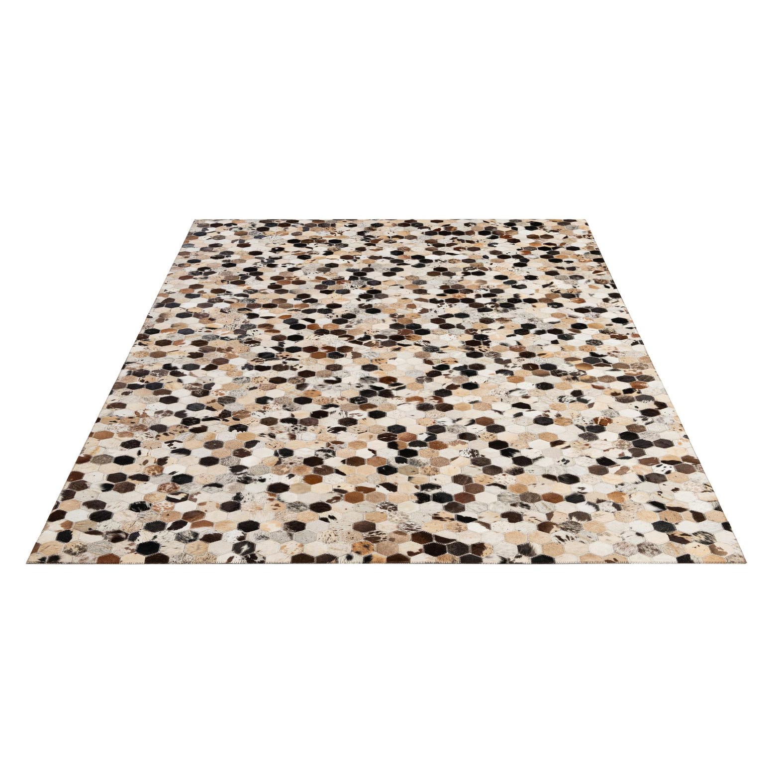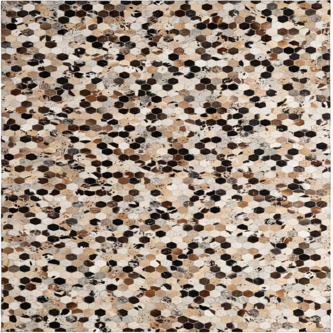 A 5x8 rectangular Cowhide Patchwork rug featuring a modern pattern of multi-colored hexagonal cowhide and leather pieces.