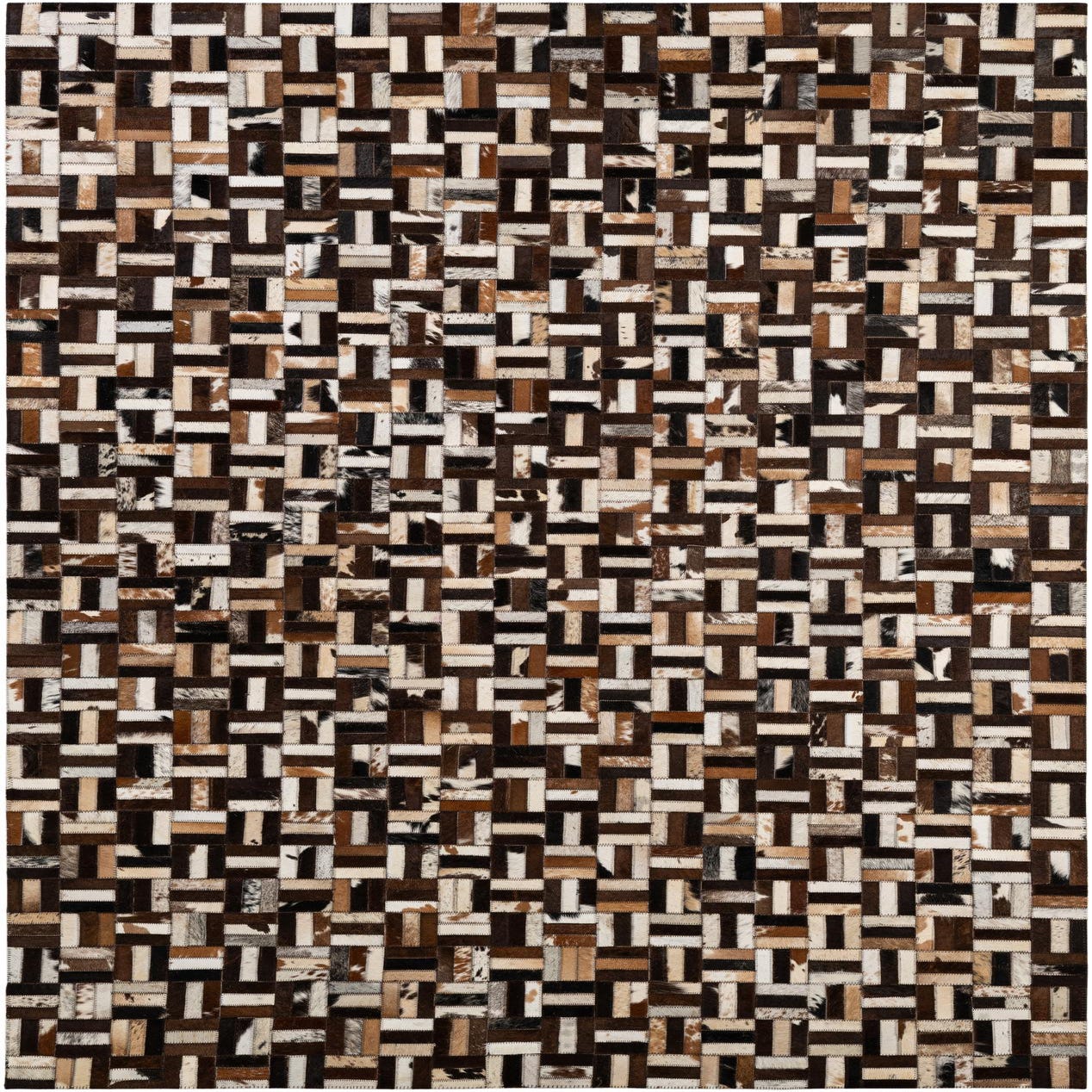 A 5x8 rectangular cowhide patchwork rug featuring a modern stripe pattern in multi-colored brown, black, and white tones.
