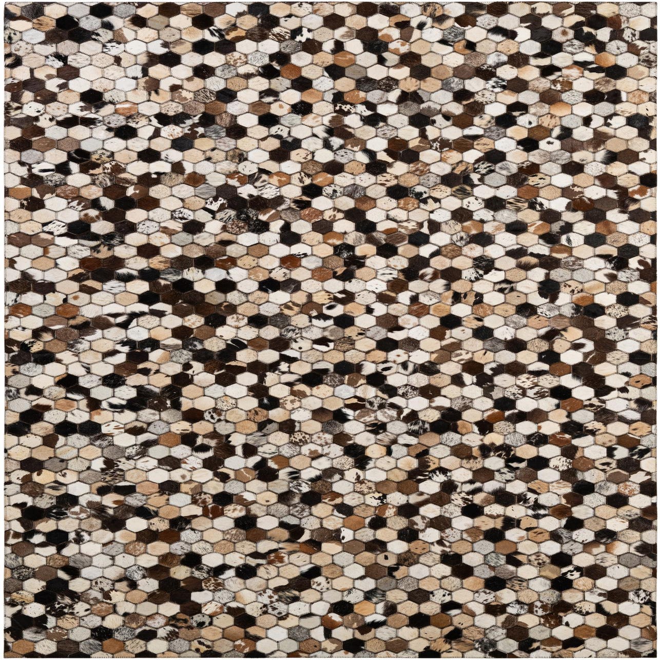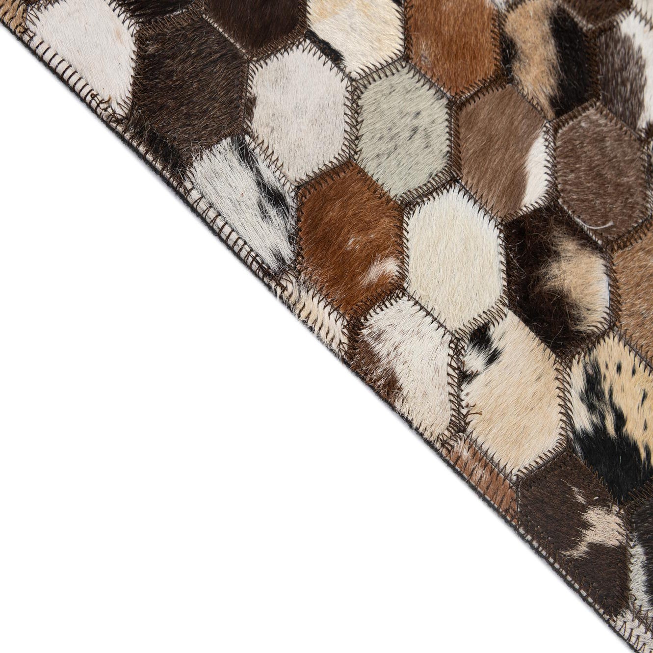 A rectangular 5x8 modern rug made of multi-colored cowhide and leather in a hexagonal patchwork pattern.