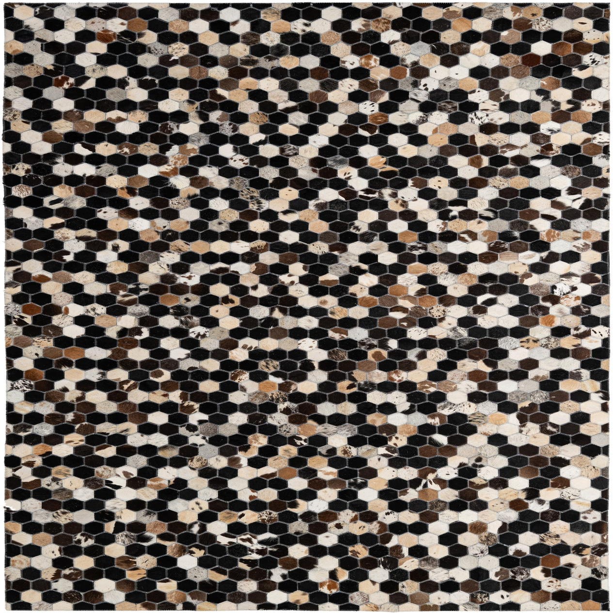A 5x8 rectangular Cowhide Patchwork rug featuring a modern hexagonal pattern in multi-colored natural cowhide and black leather.