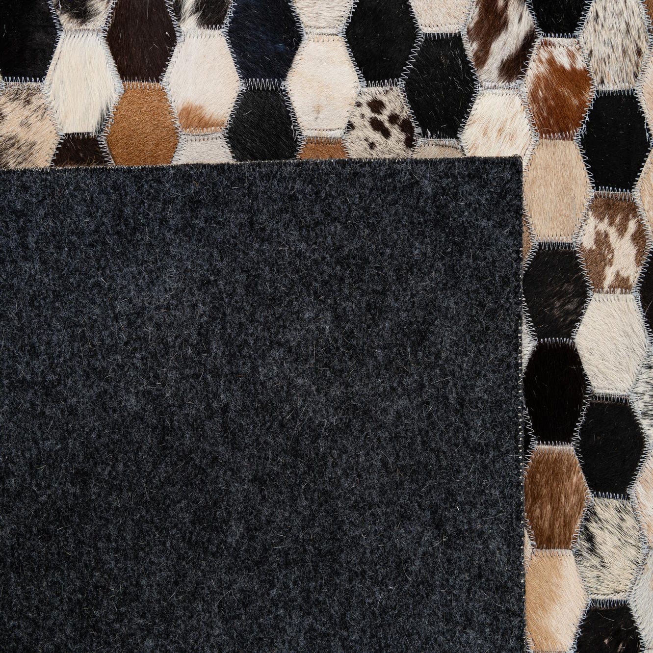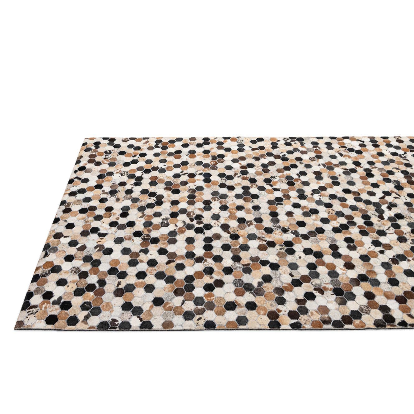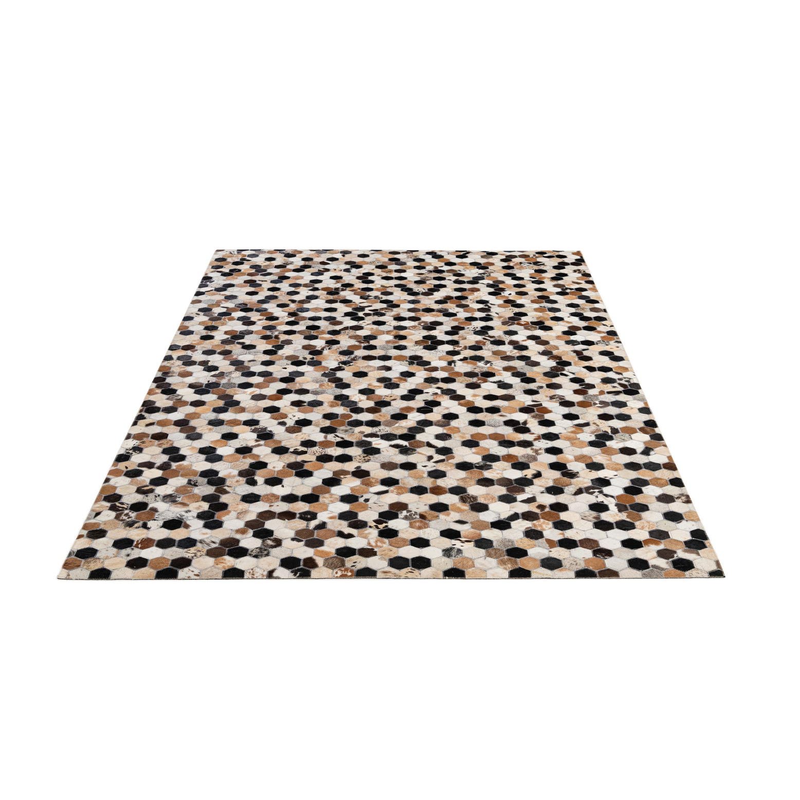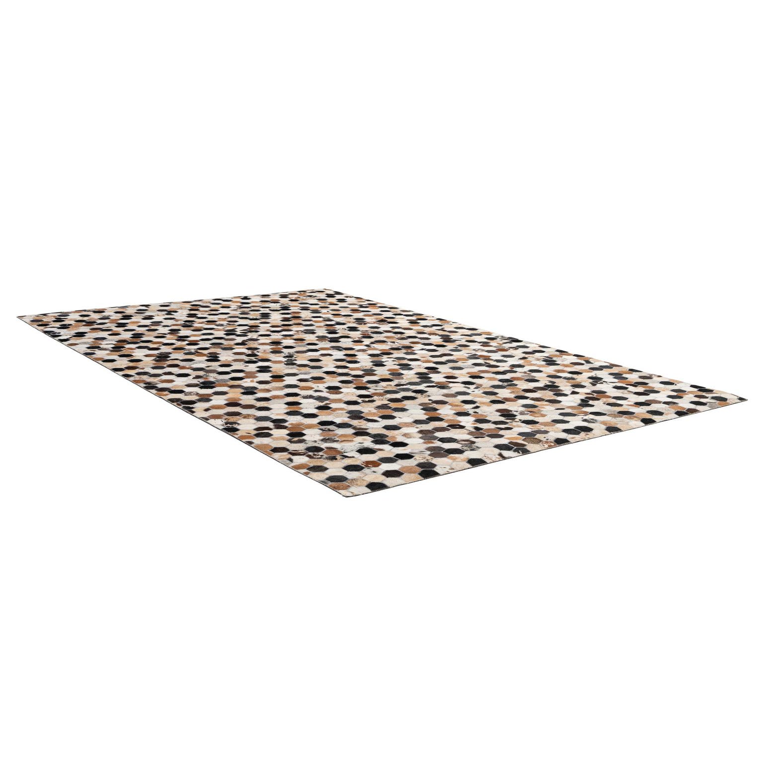 A 5x8 rectangular Cowhide Patchwork rug featuring a modern hexagonal pattern in multi-colored natural cowhide and black leather.
