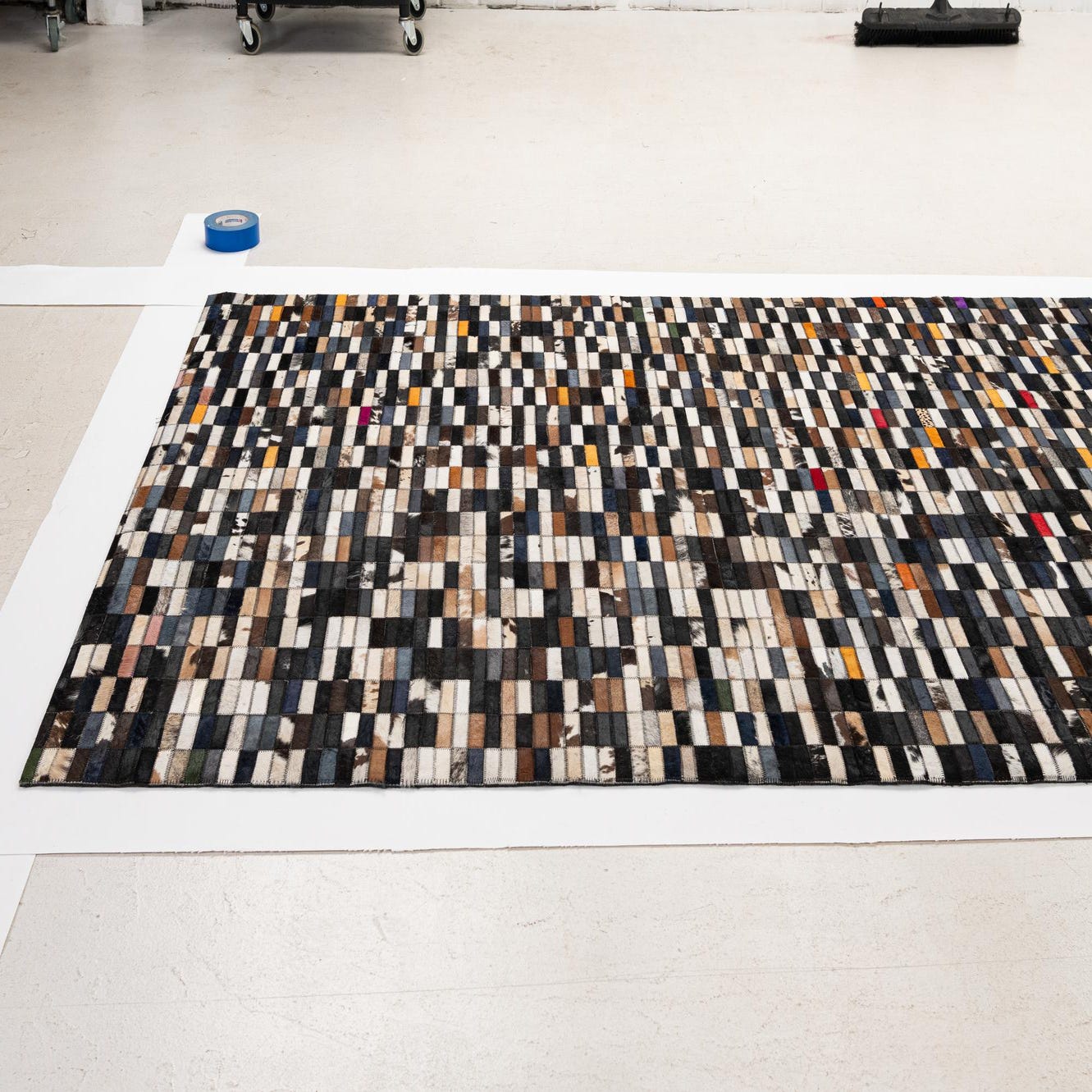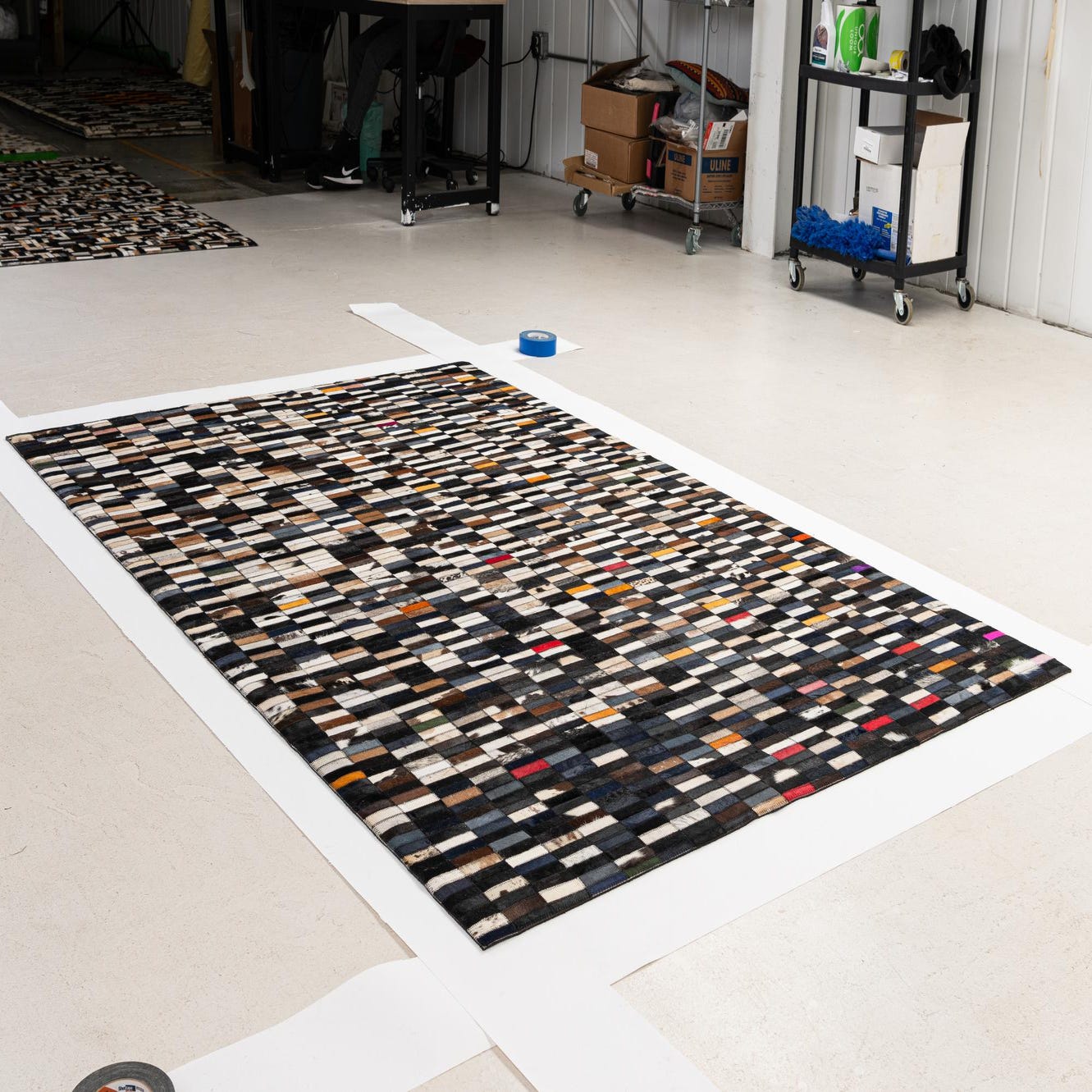 A 5x8 rectangular Cowhide Patchwork rug with a modern stripe pattern in multi-colored hues, featuring black, white, brown, and various accent colors.