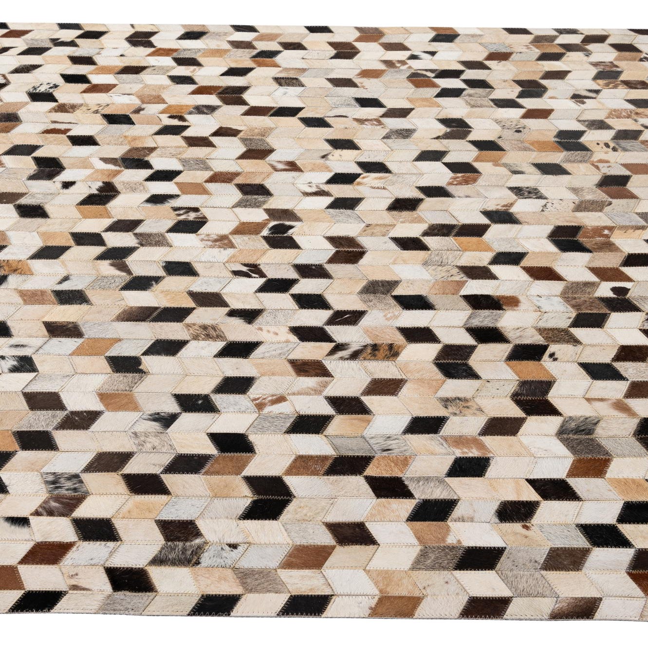 A 5x8 rectangular Cowhide Patchwork rug featuring a modern chevron pattern in multi-colored natural cowhide and leather.
