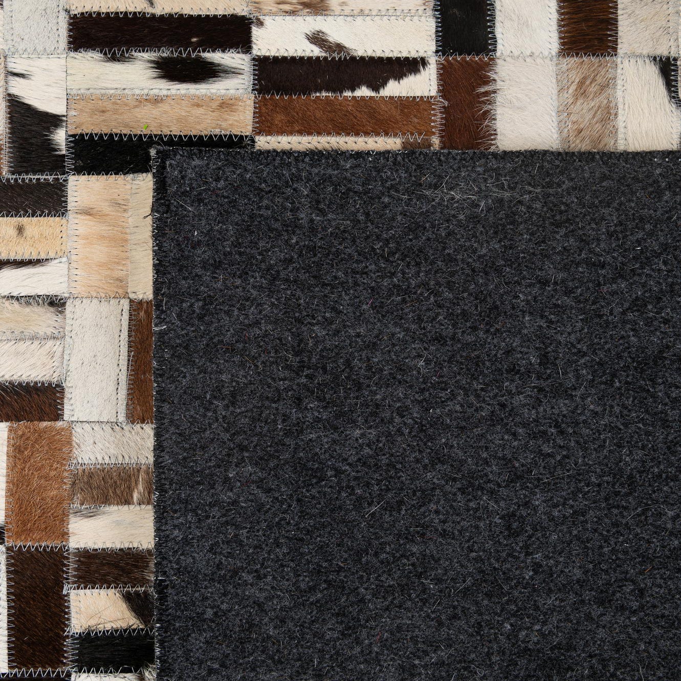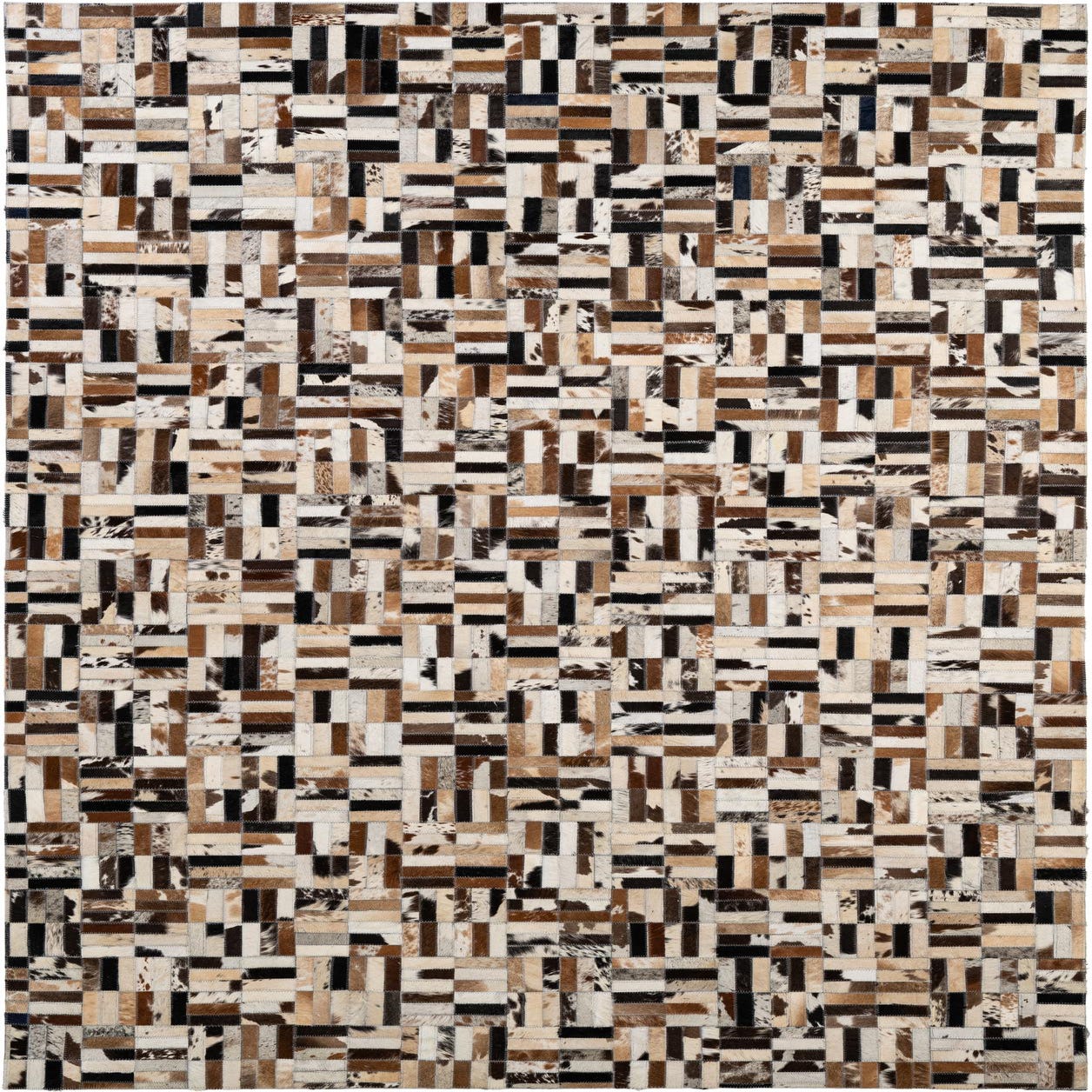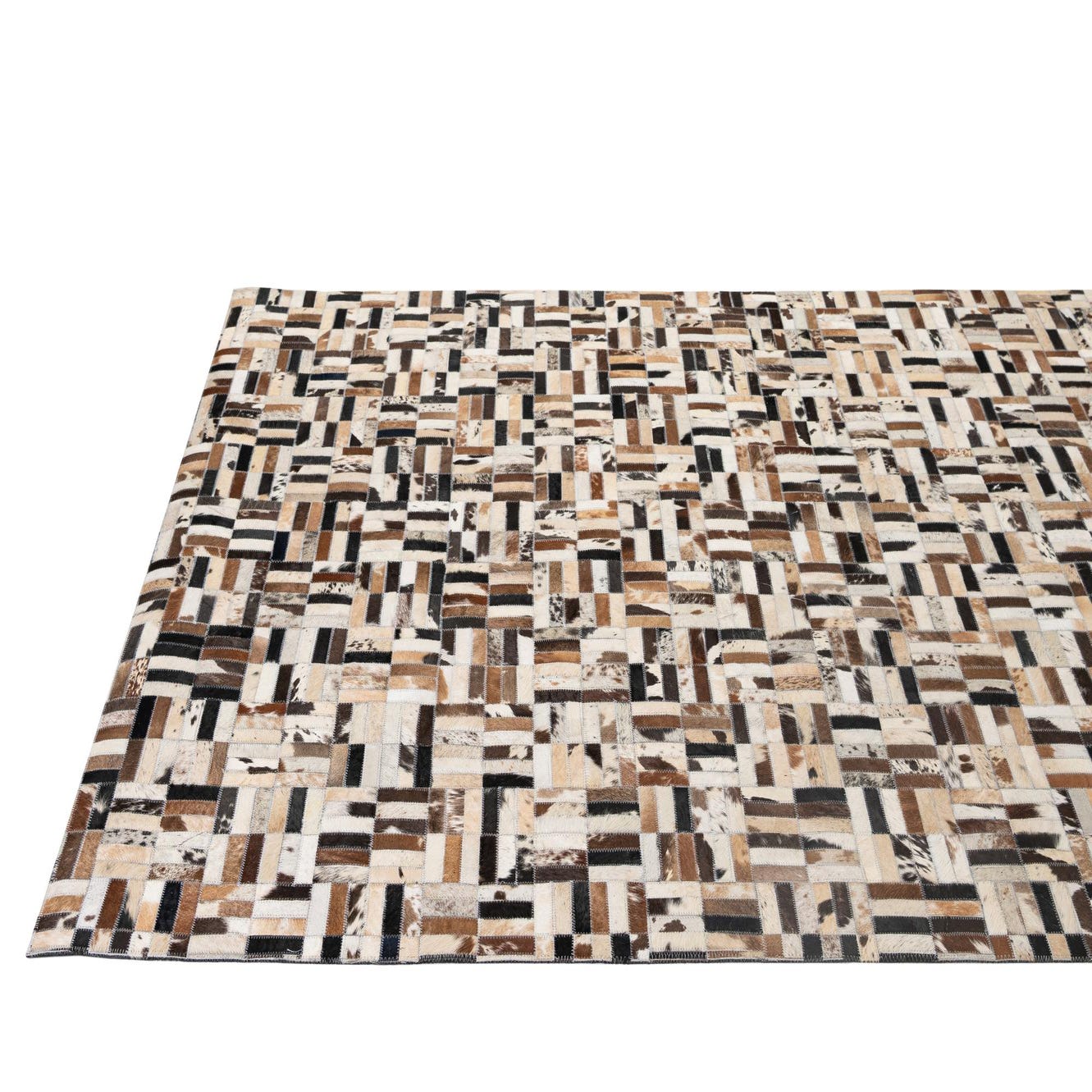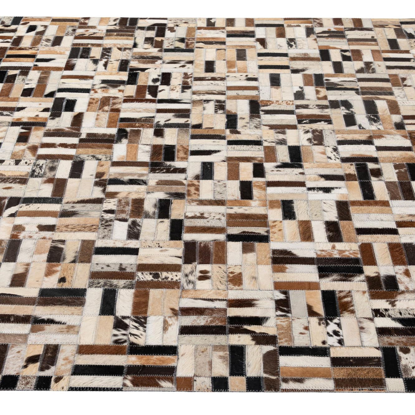 A 5x8 rectangular Cowhide Patchwork rug featuring varied natural brown, black, and white fur patches stitched together in a modern stripe pattern.