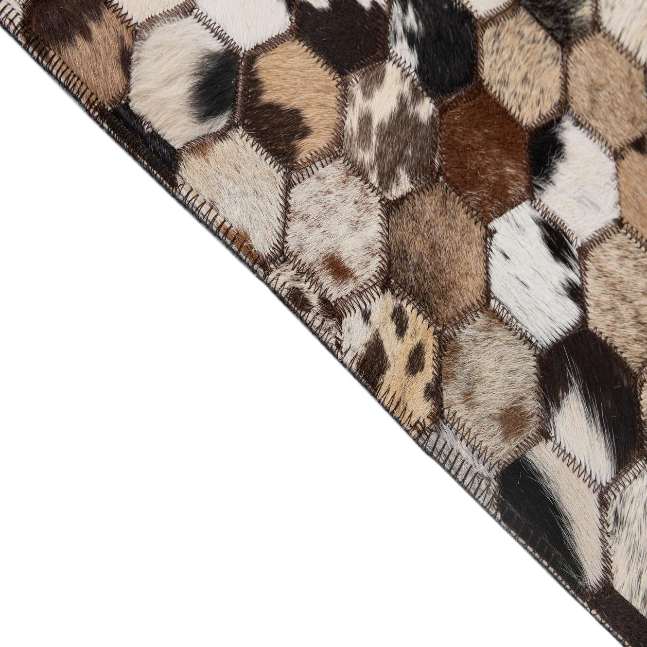 A rectangular 5x8 multi-colored cowhide rug with a modern hexagonal patchwork pattern, ideal for a living room.